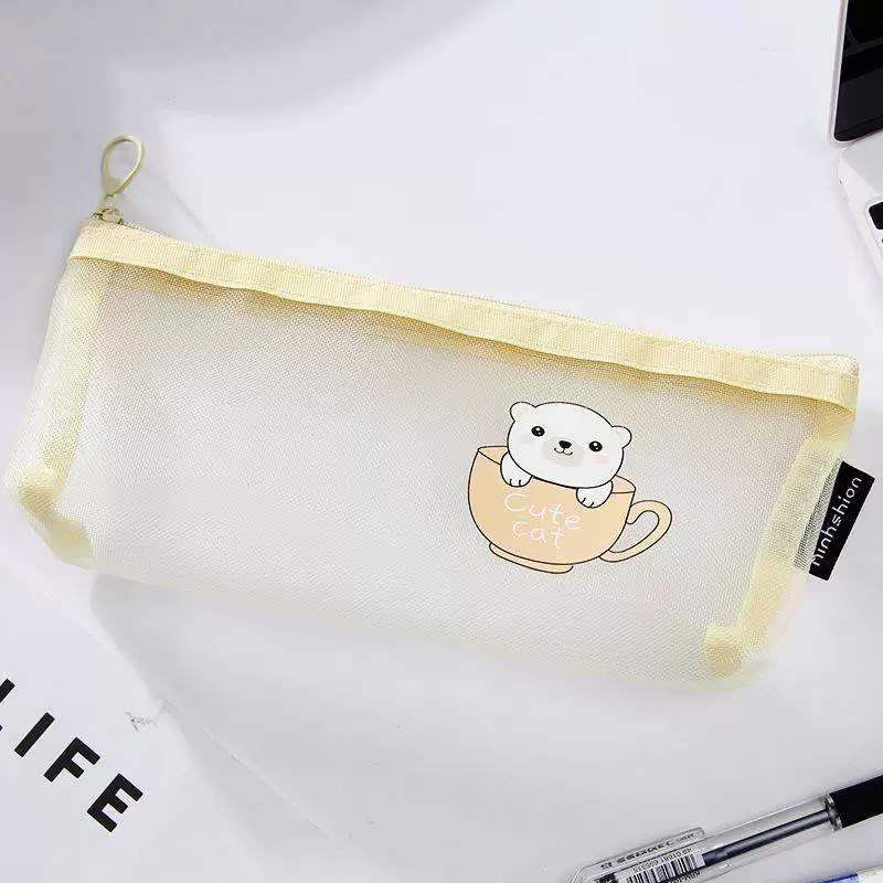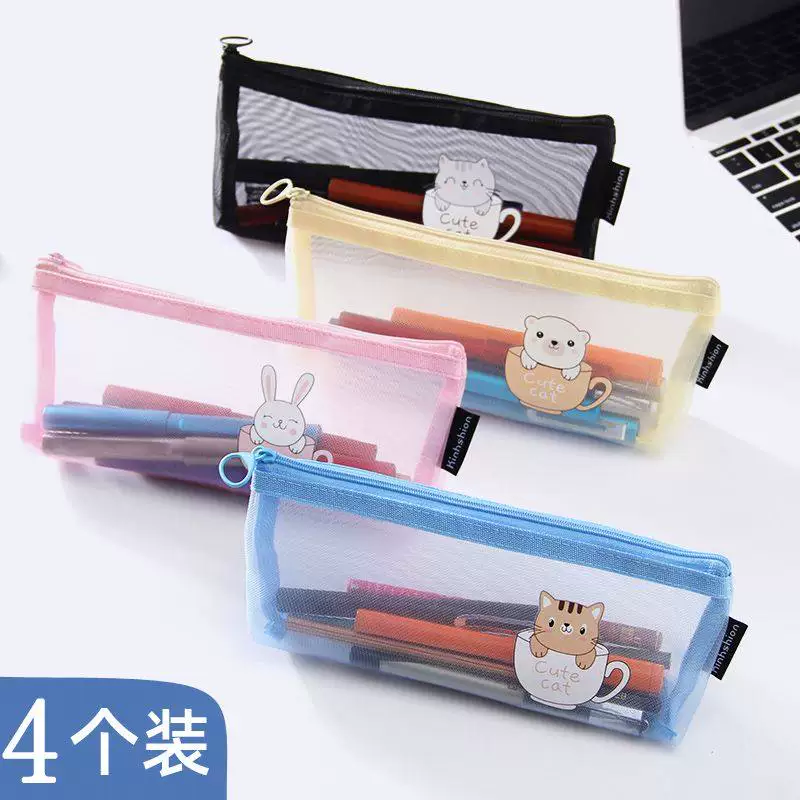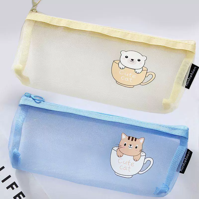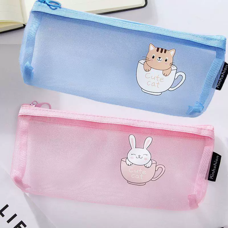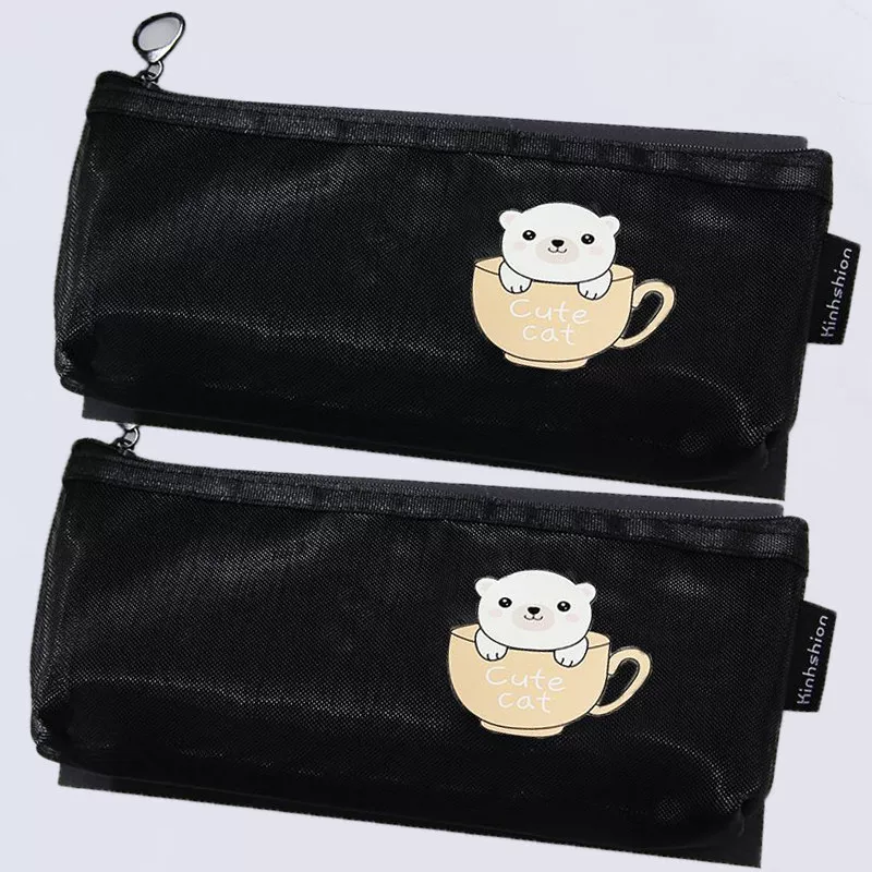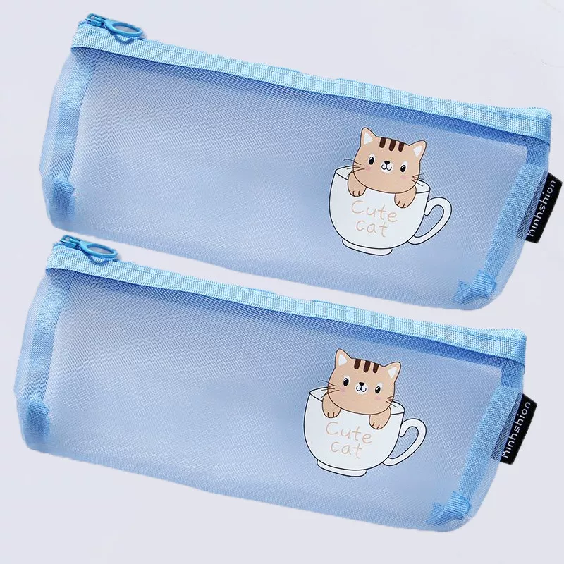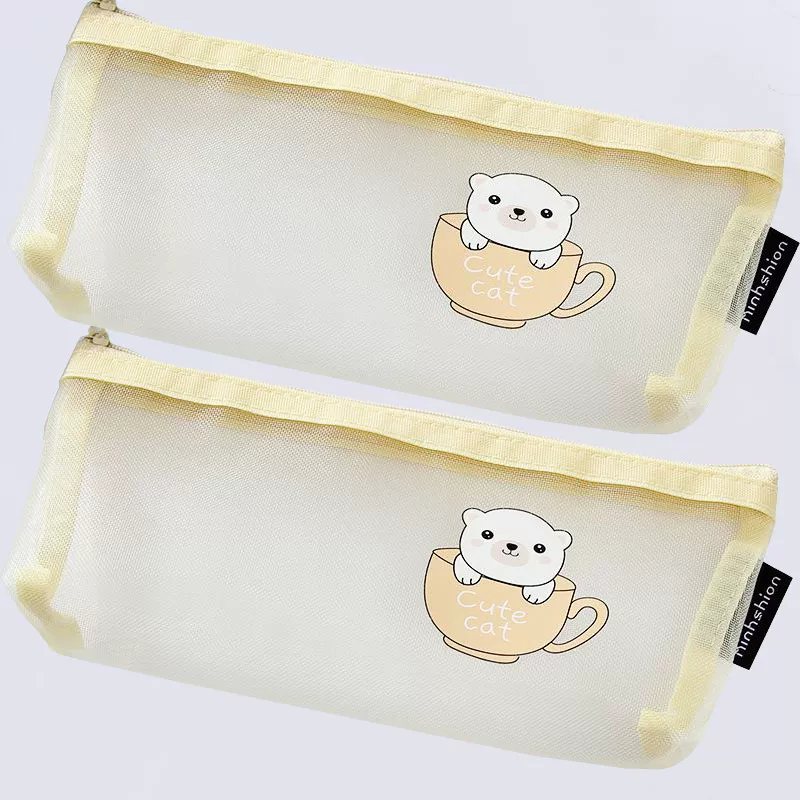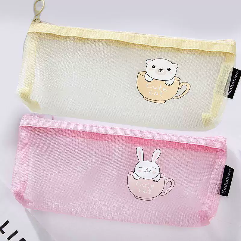 Ins Simple Transparent Pencil Case with Mesh, Thickened Large-Capacity Stationery Bag, Cartoon Design for Elementary School Students, High-Value Back-To-School Gift