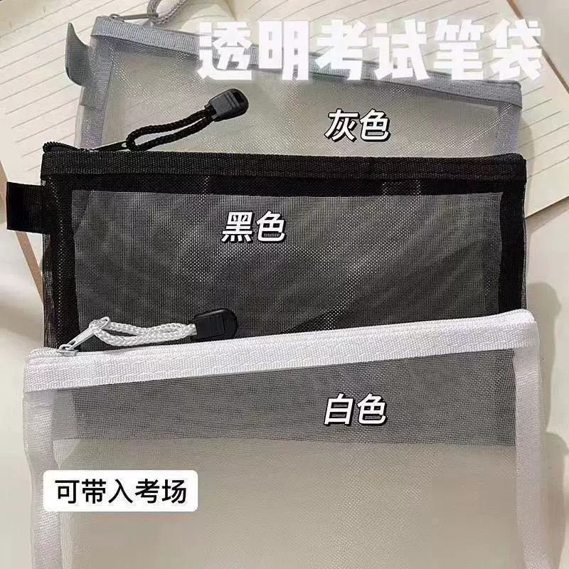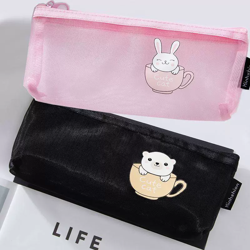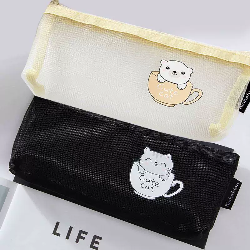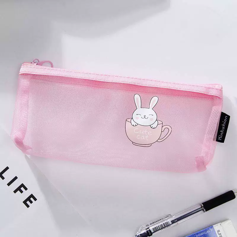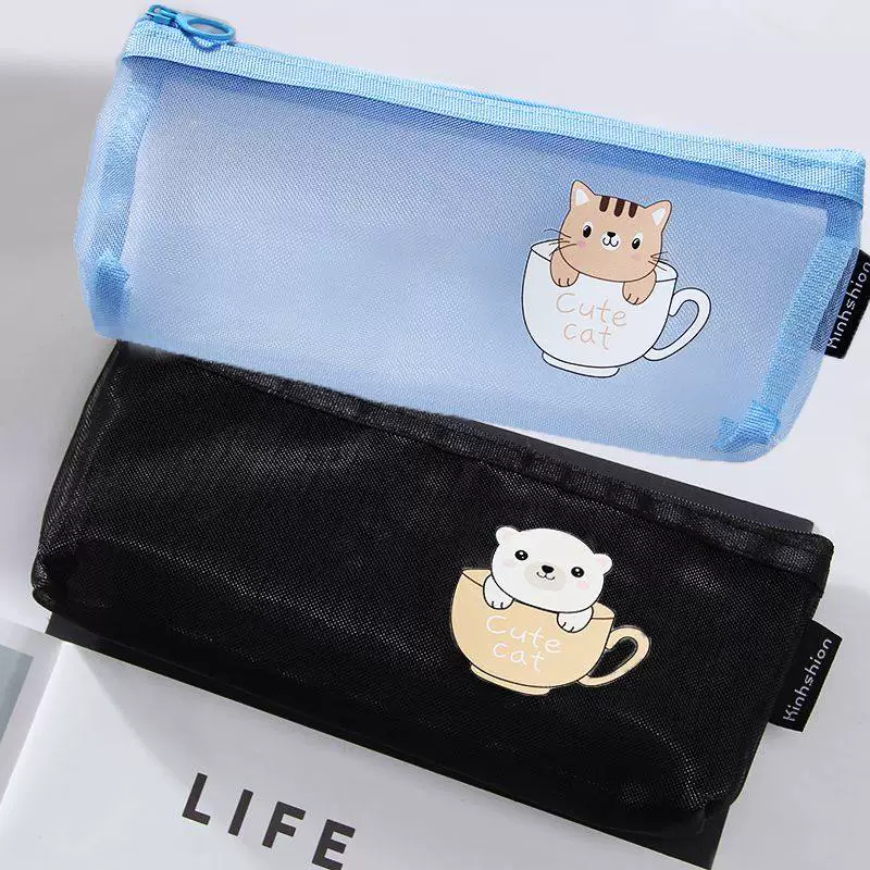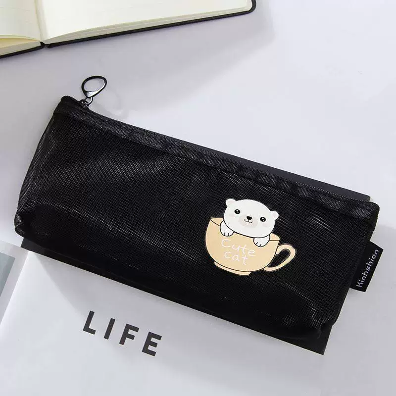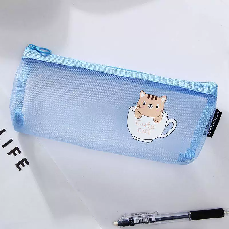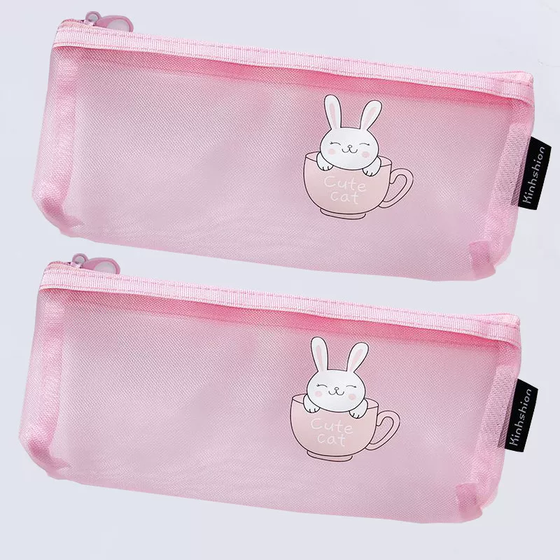 Ins Simple Transparent Pencil Case with Mesh, Thickened Large-Capacity Stationery Bag, Cartoon Design for Elementary School Students, High-Value Back-To-School Gift