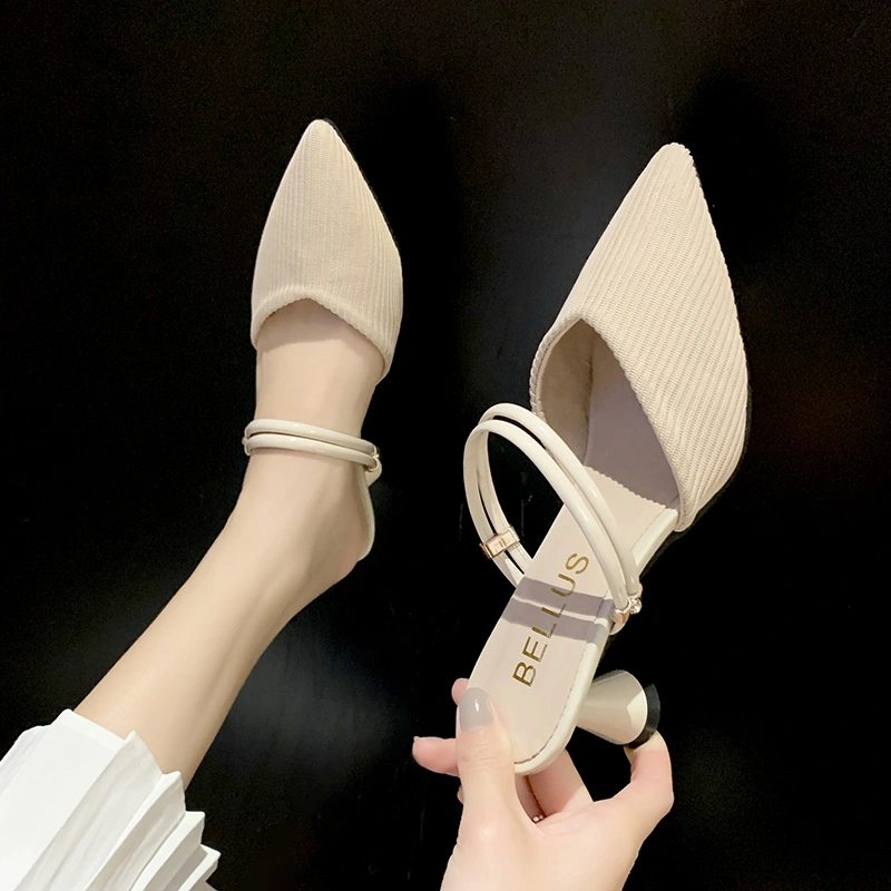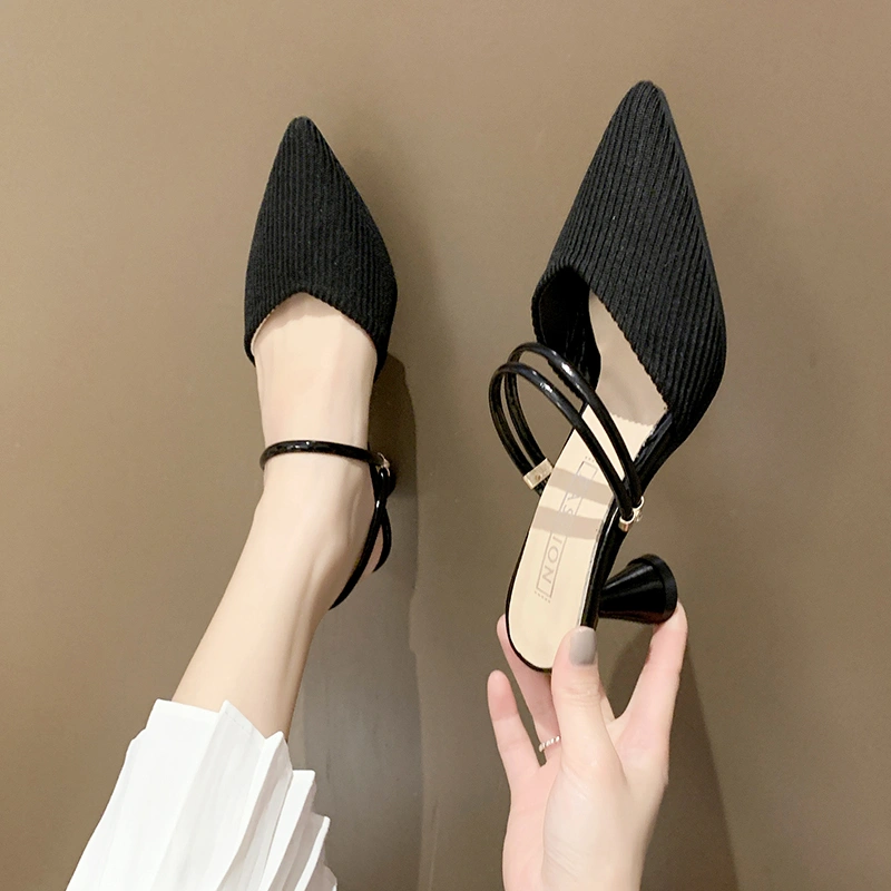 Women's Pointed-Toe Mules with Thick Heels, Korean Style Knitted Half-Slippers, Fairy Style, Summer 2025 New Model