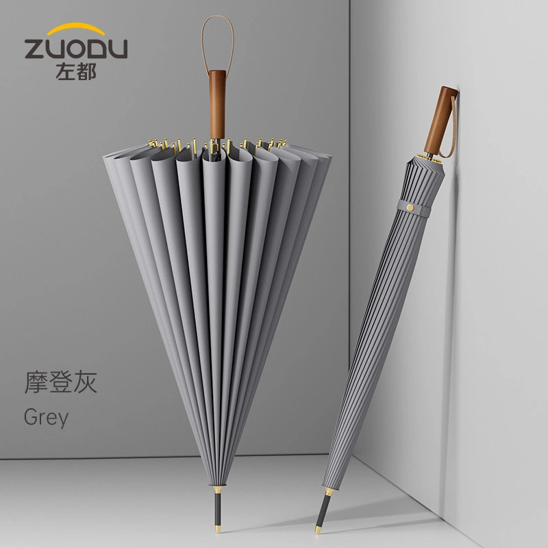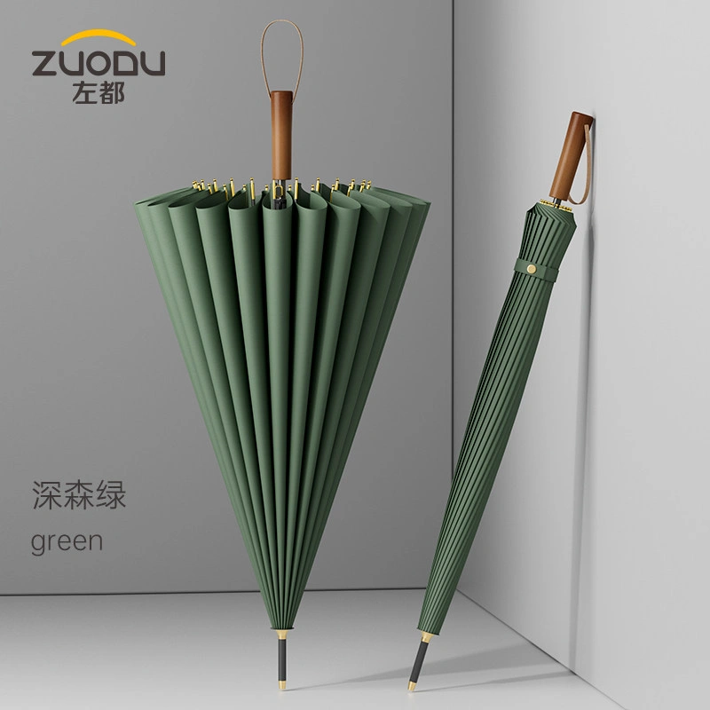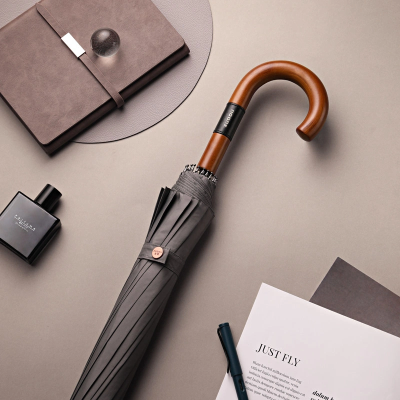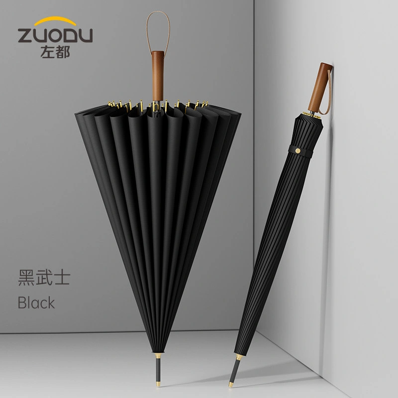 Left-Hand Wooden Handle Long Straight Black Umbrella, Extra Large, Reinforced, Thickened, Storm-Resistant, Automatic Umbrella for Men, Household Use, Double