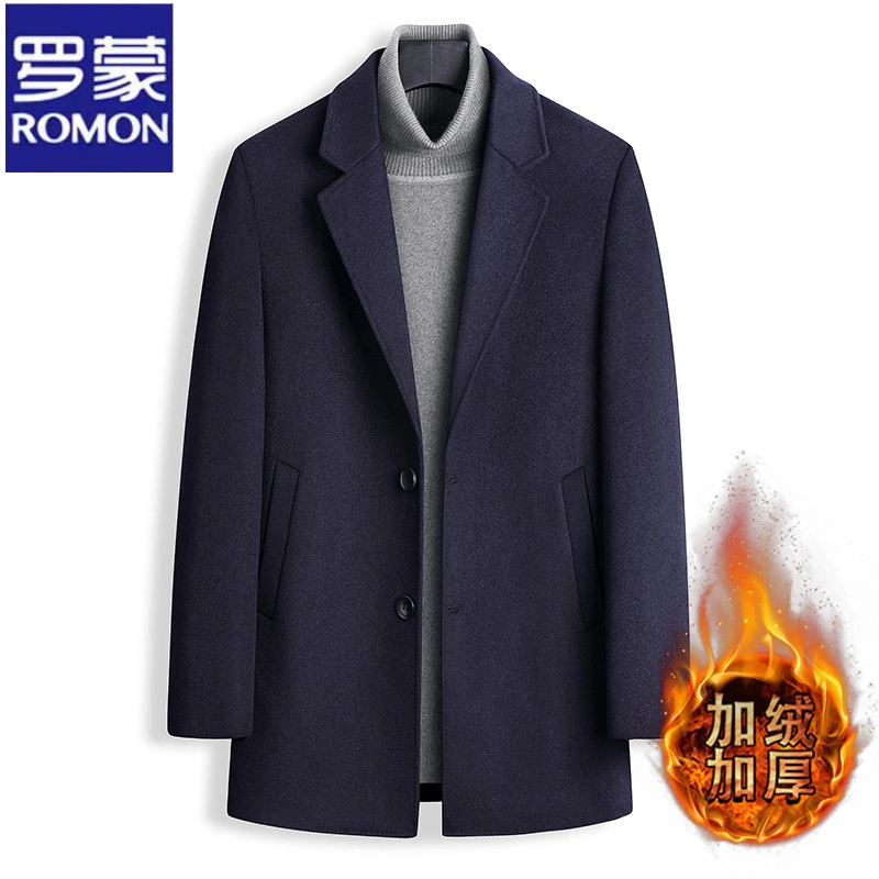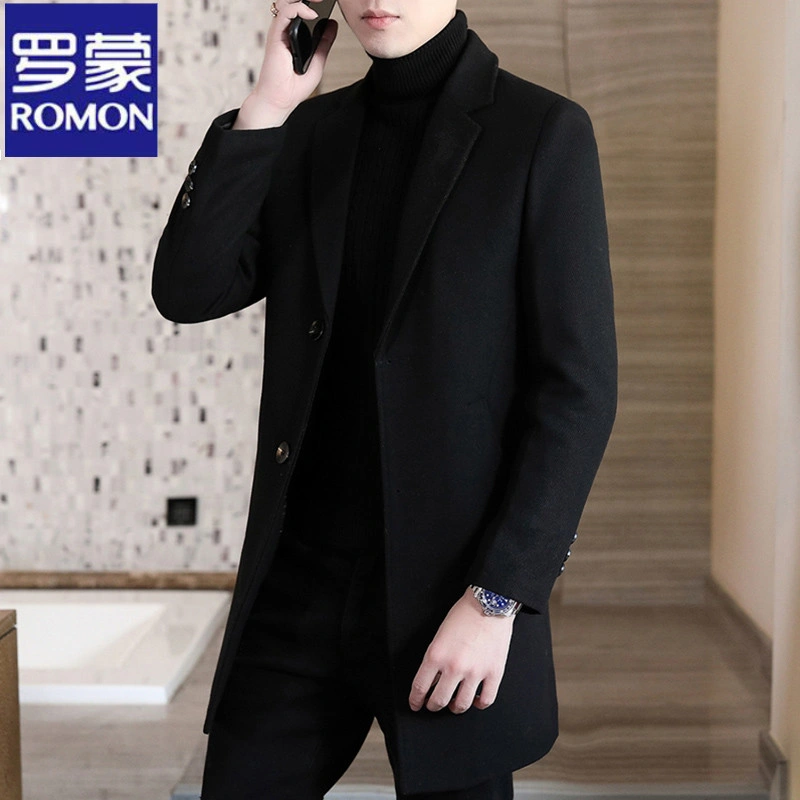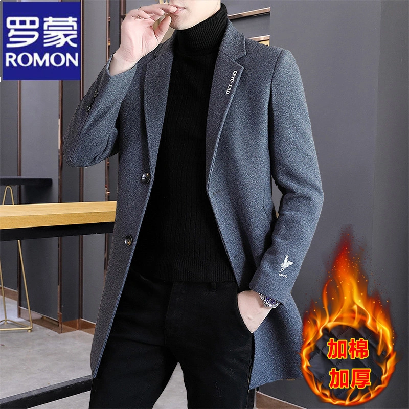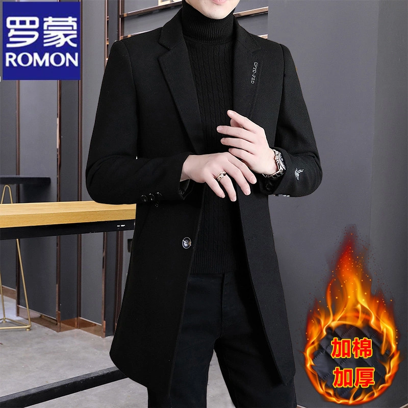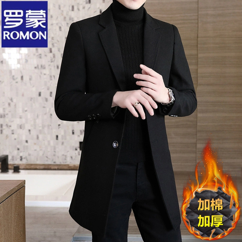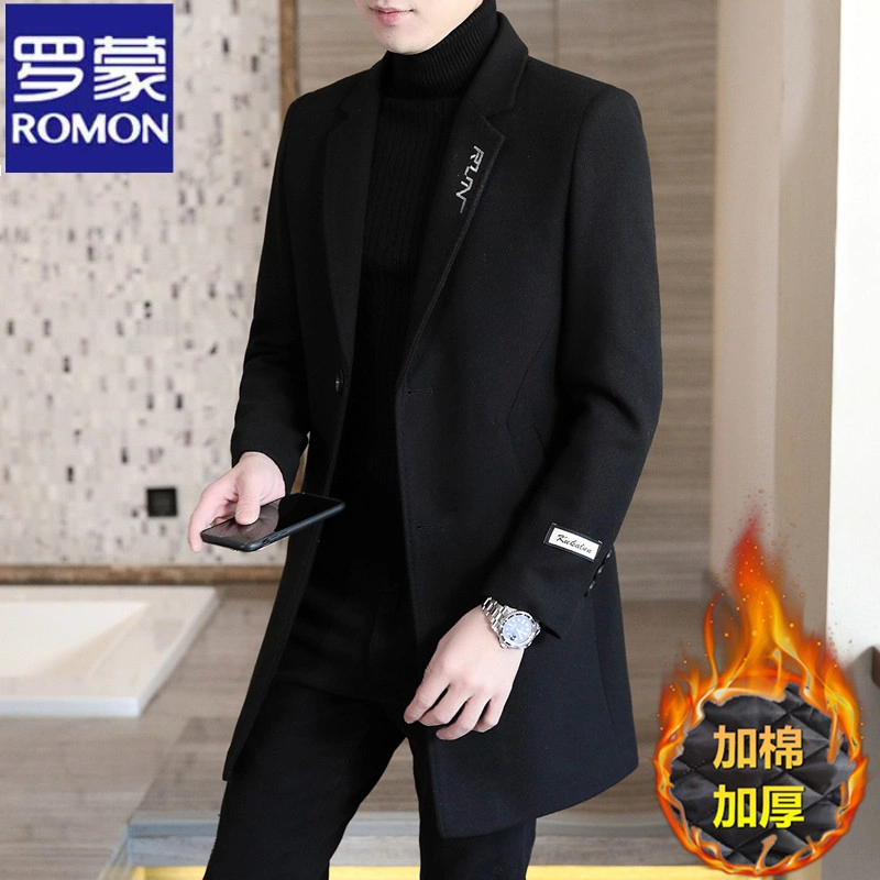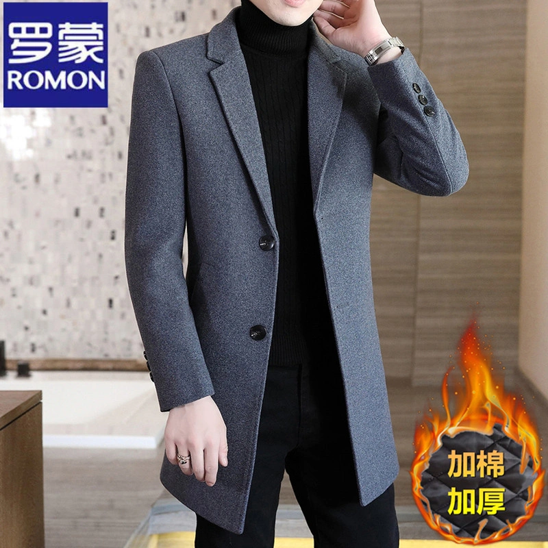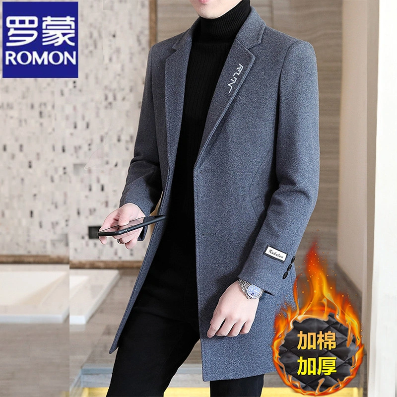 Romon Woolen Coat for Men, Thickened Cashmere Woolen Jacket, Slim Fit Business Mid-Length Casual Youth Trench Coat