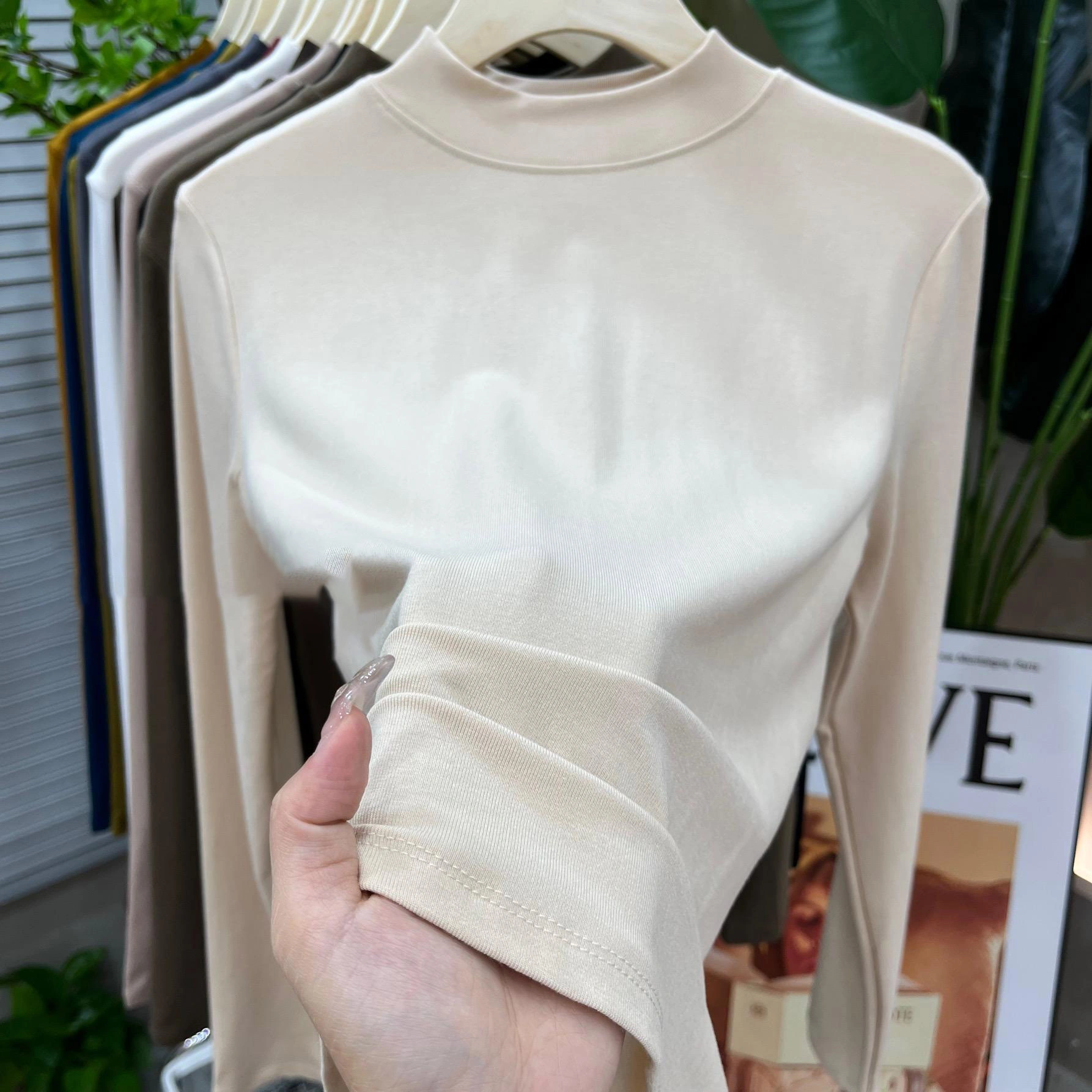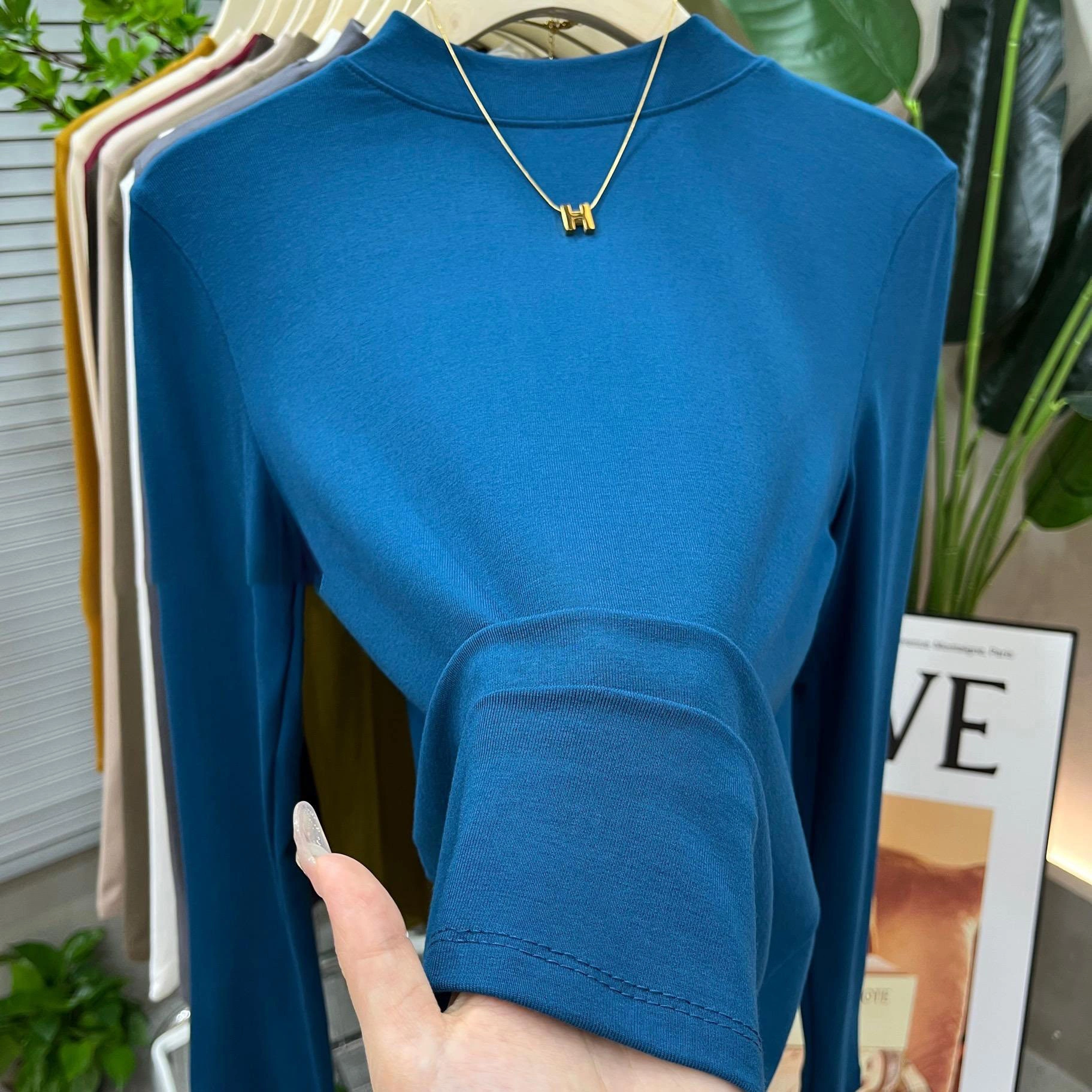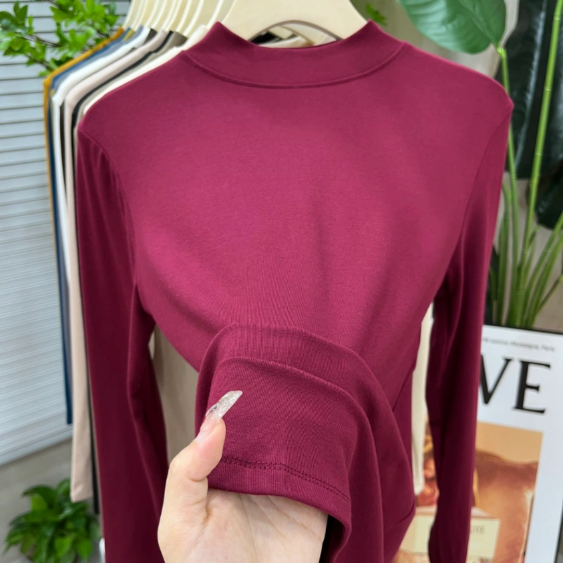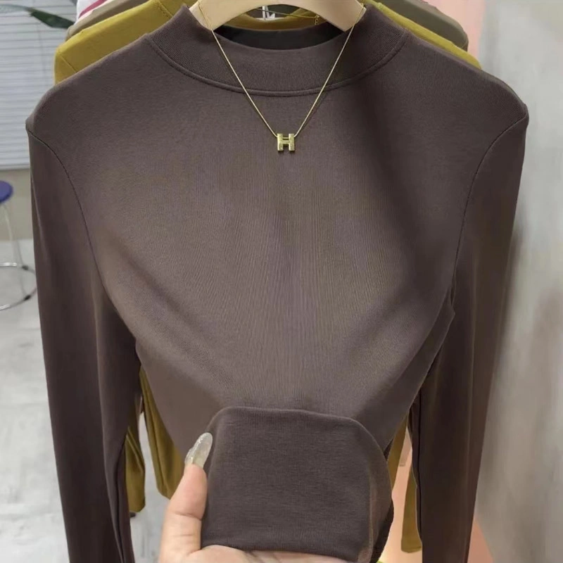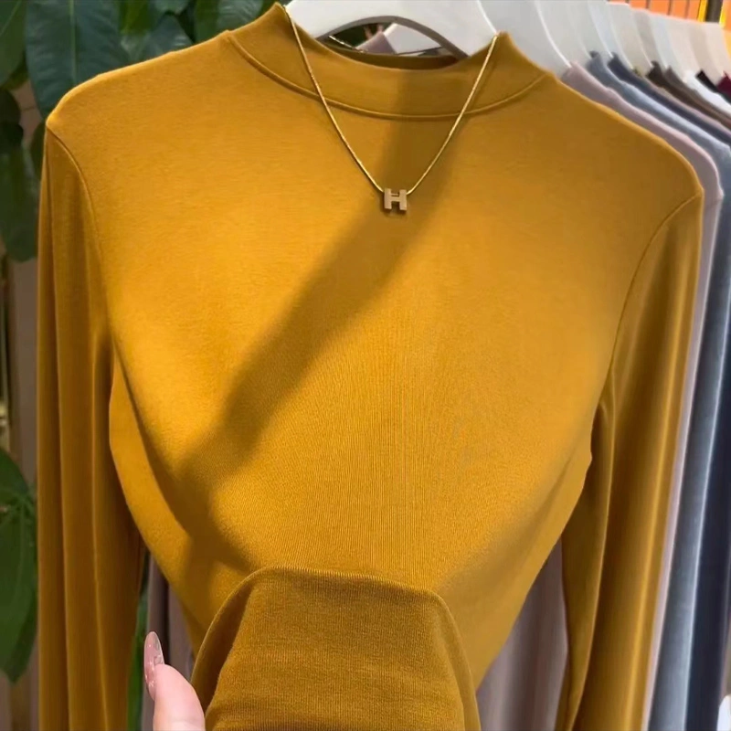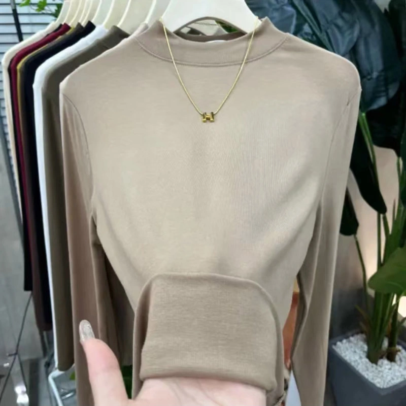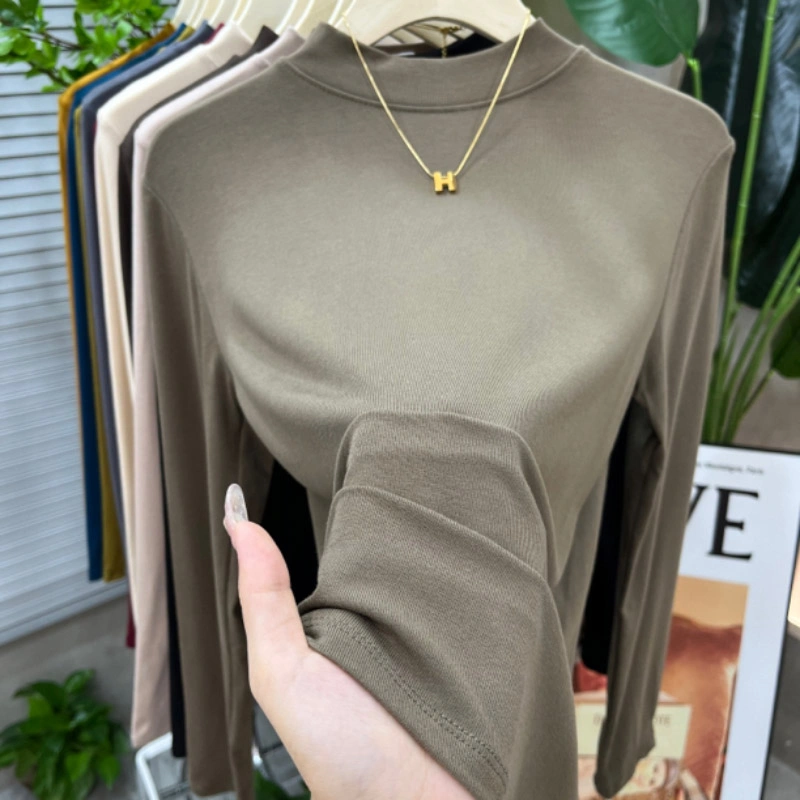 2024 New Women's Solid Color Fashionable Versatile Slim-Fit Base Shirt T-Shirt Spring and Autumn Mid-Neck Top Half-High Collar