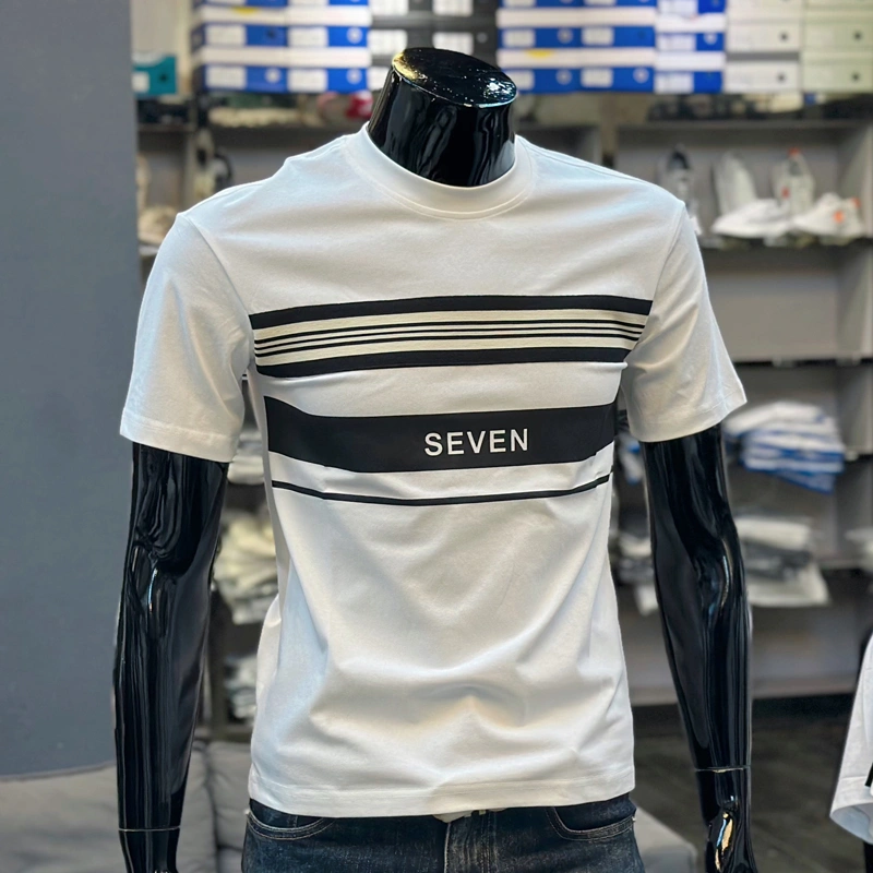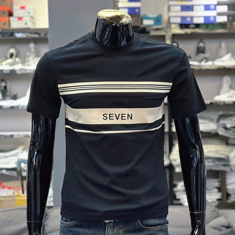 European High-End Printed Striped Short-Sleeve T-Shirt for Men ins Trendy Slim-Fit Summer New Versatile Round-Neck Half-Sleeve