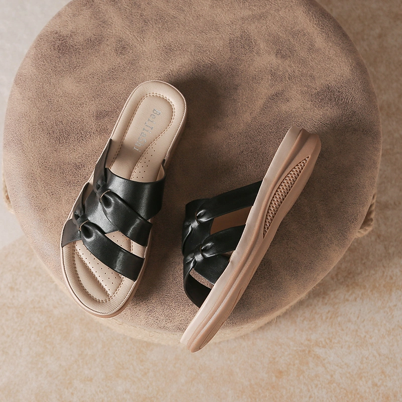 Middle-Aged and Elderly Women's Slippers for Outdoor Wear, New Summer Style, Genuine Leather, Flat, Comfortable, Soft-Soled, Non-Slip, Wedge Heel, Large Size Sandals for Mothers