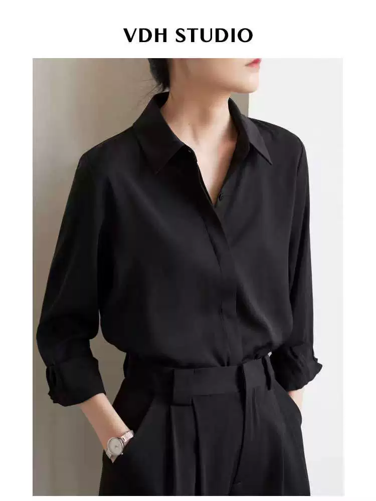 Early Summer French-Style Commuter Satin Black Shirt for Women, Professional Texture, Regular Shoulder Shirt Top
