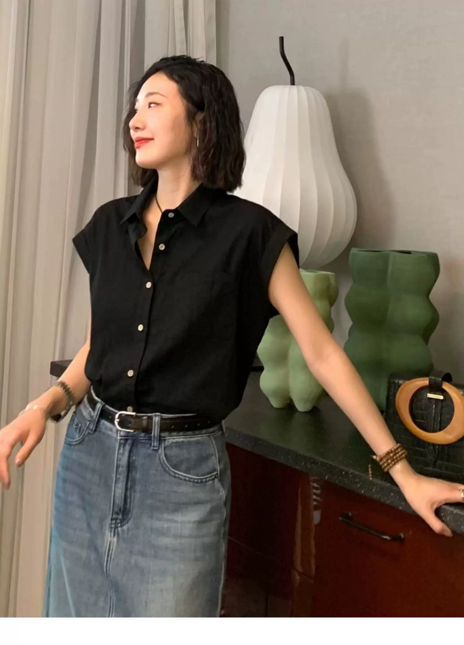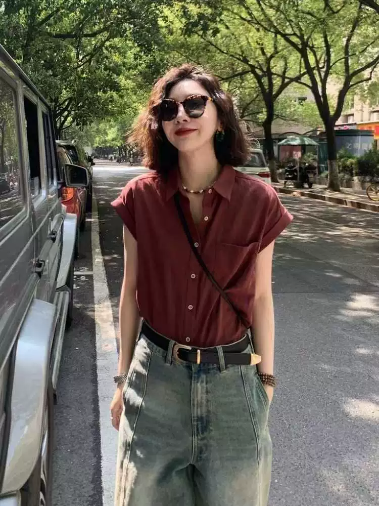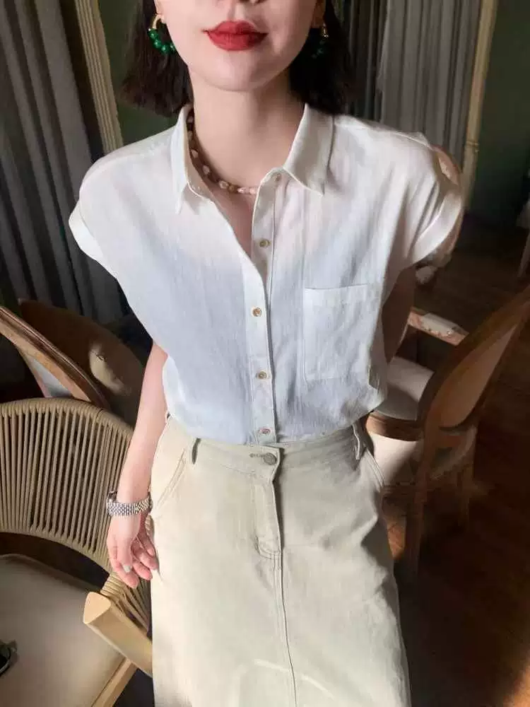 French-Style Short-Sleeved Shirt for Women, Summer 2023 New Design, Niche Sleeveless Shirt, Cotton and Linen Top, Summer Women's Style