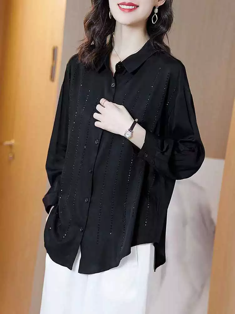 New Black Heavy-Duty Shiny Rhinestone Shirt with Drape Effect for Women 2023 Loose Polyester Solid Color Shirt
