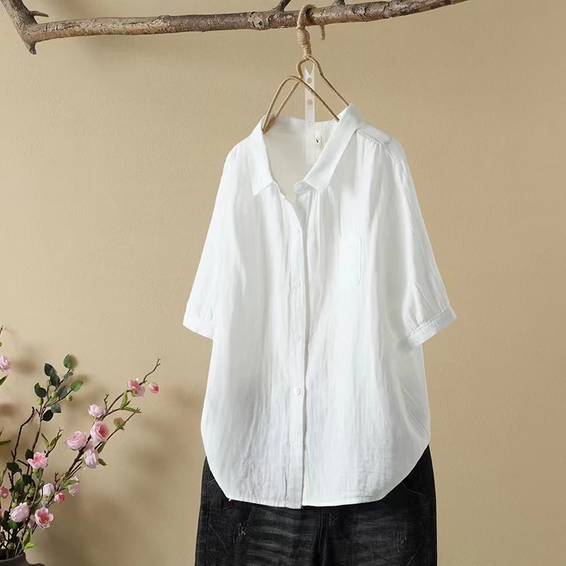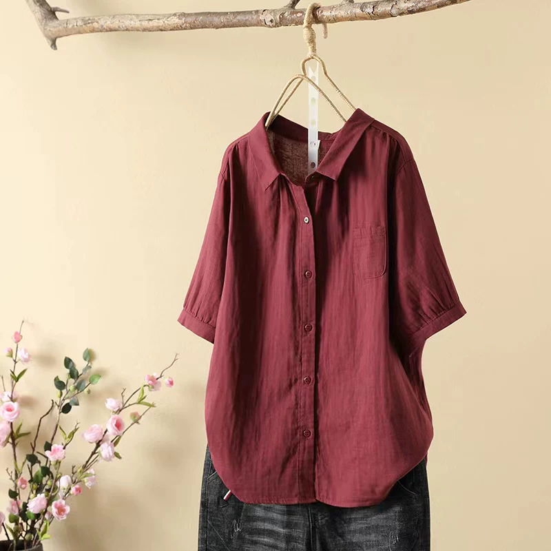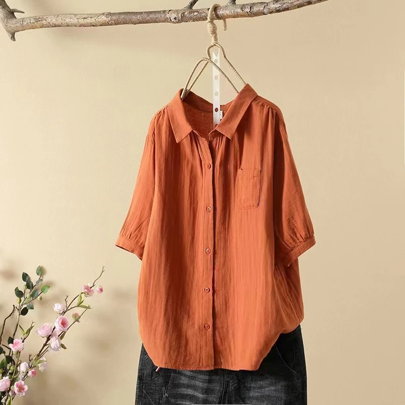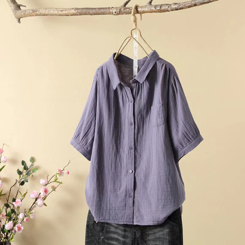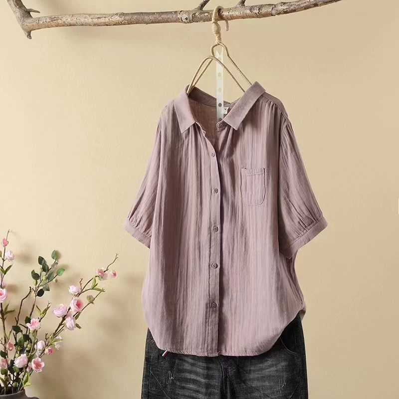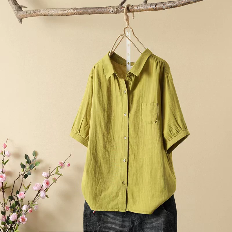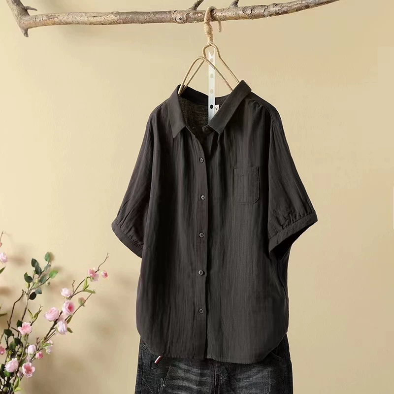2023 Summer New Breathable and Comfortable Lapel Shirt, Loose Short-Sleeved Casual Thin Artistic Shirt, Solid Color