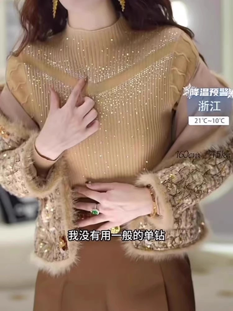 European Goods 2025 Autumn New Style Elegant Top for Women, High-End Half-High Collar, Heavy-Duty Rhinestone Pullover Long-Sleeve Knitwear