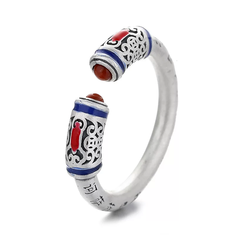 Vintage Distressed Red Agate Heart Sutra Engraved Ethnic Ancient Style Trendy Open Ring