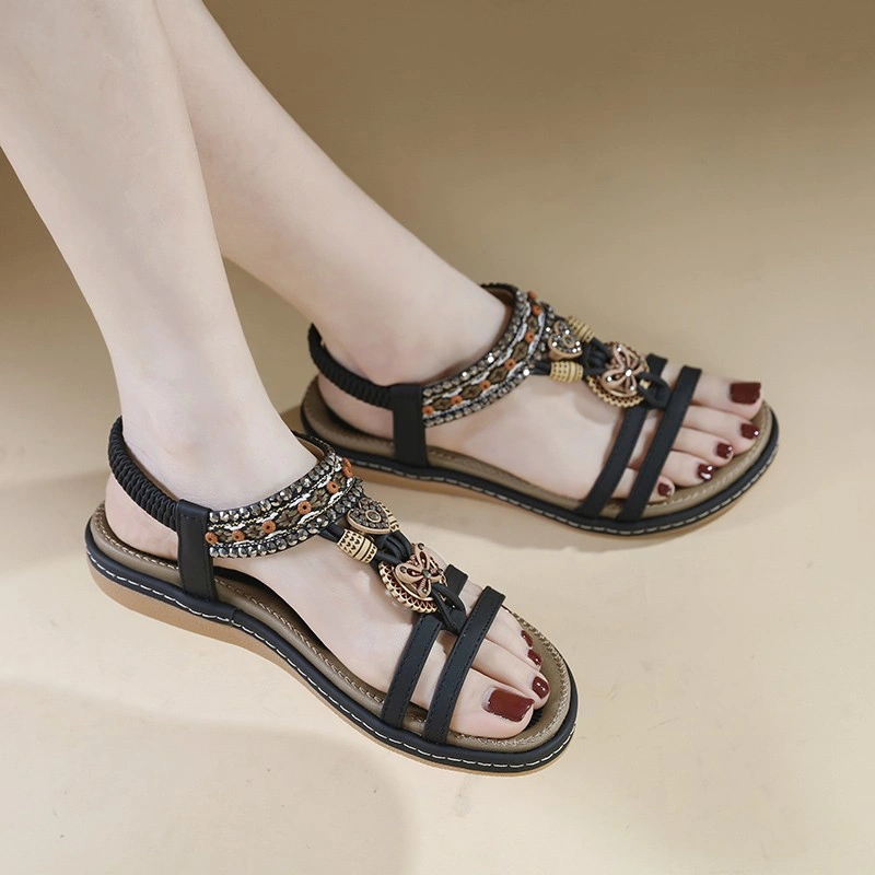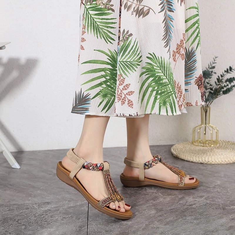 Ethnic Style Flat Sandals for Women, Genuine Leather, Bohemian Rhinestones, Lightweight and Comfortable, Middle-Aged and Elderly Mothers' Travel Beach Shoes