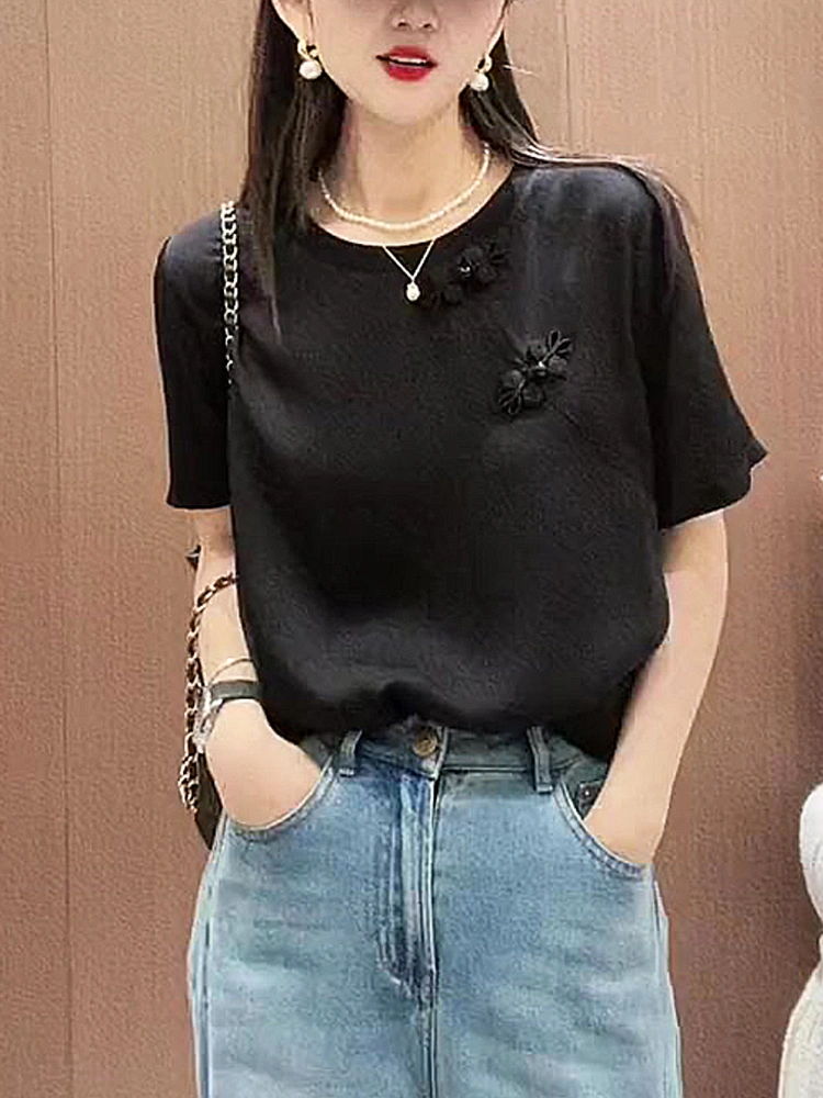 Black Round-Neck New Chinese-Style Button T-Shirt 2025 New Popular Style for Slightly Chubby Women, High-End Designer Plus-Size Top