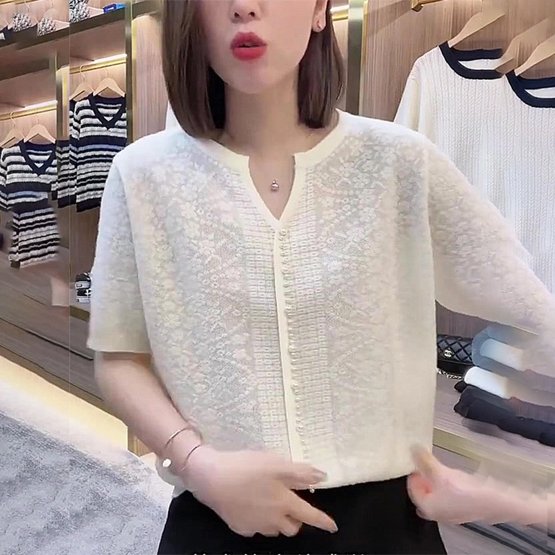 Jacquard Chinese-Style Top 2025 Summer New Popular White Round-Neck Heavy Beaded Thin Large-Size Short-Sleeve T-Shirt