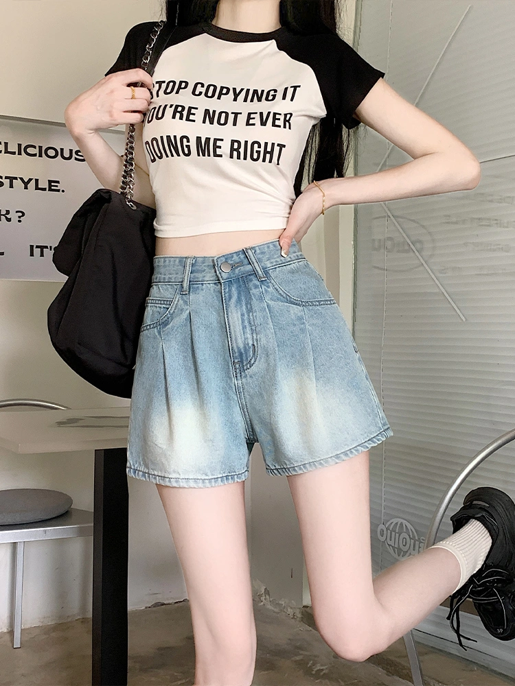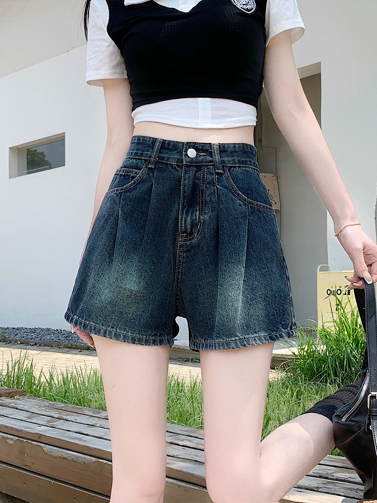 Loose Retro Pleated Wide-Leg Denim Shorts for Women, Summer Plus Size High-Waisted Petite A-Line Slimming Casual Hot Pants
