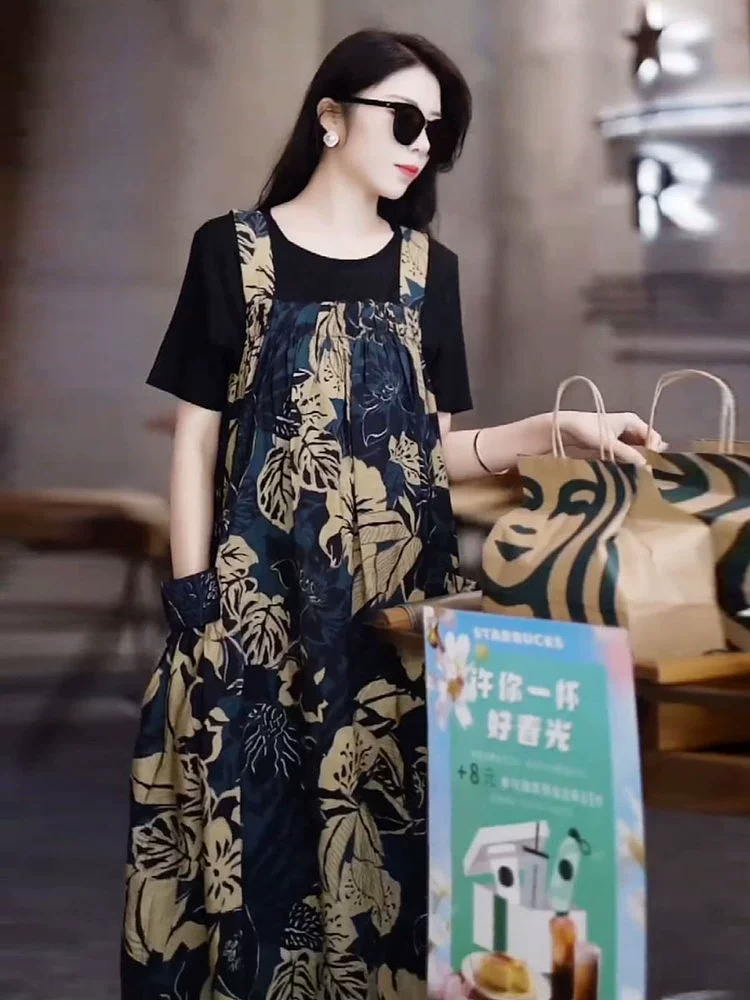 High-End Suspender Skirt Suit for Women 2024 Summer New Classy European Style Loose Belly-Covering Suspender Skirt + Short-Sleeved T-Shirt