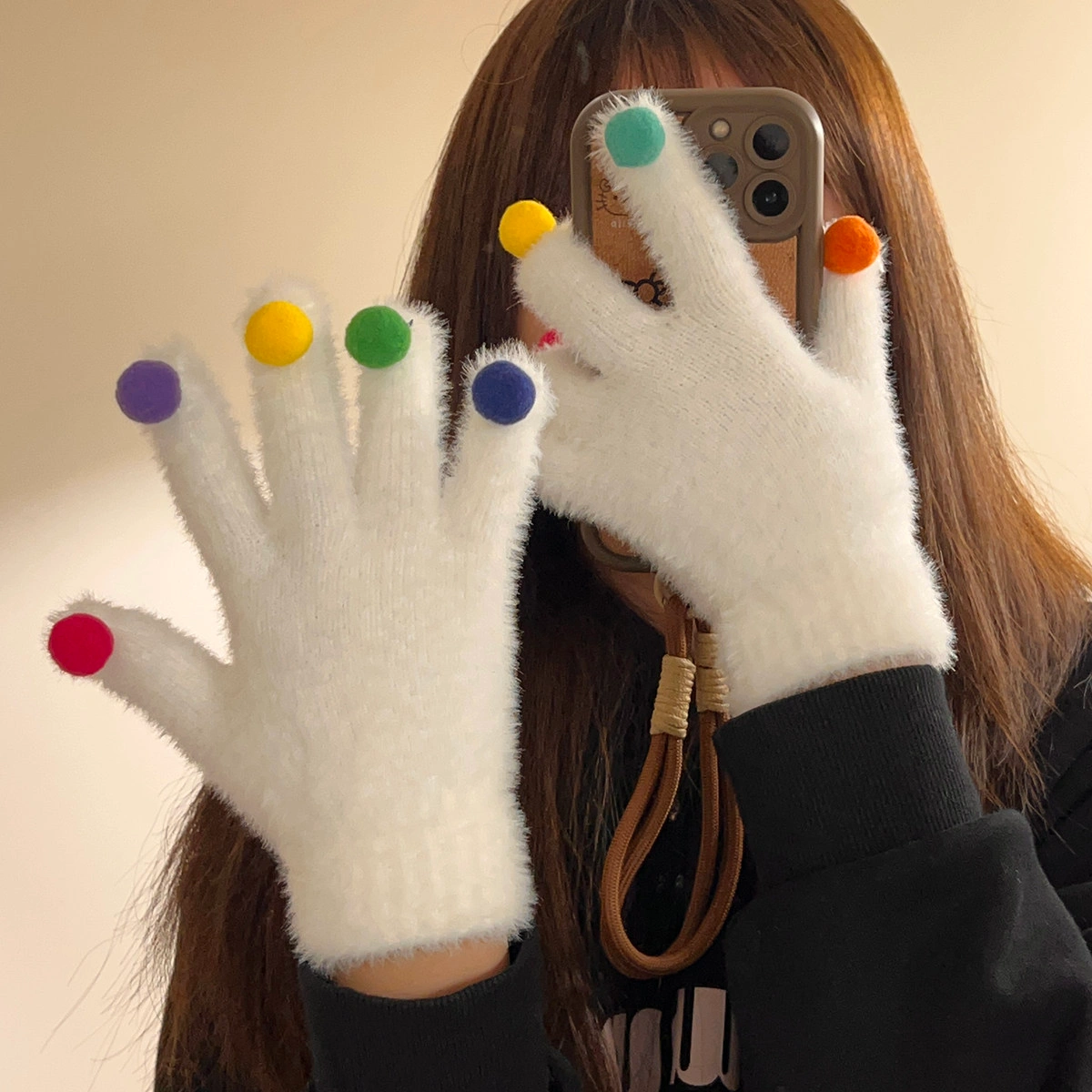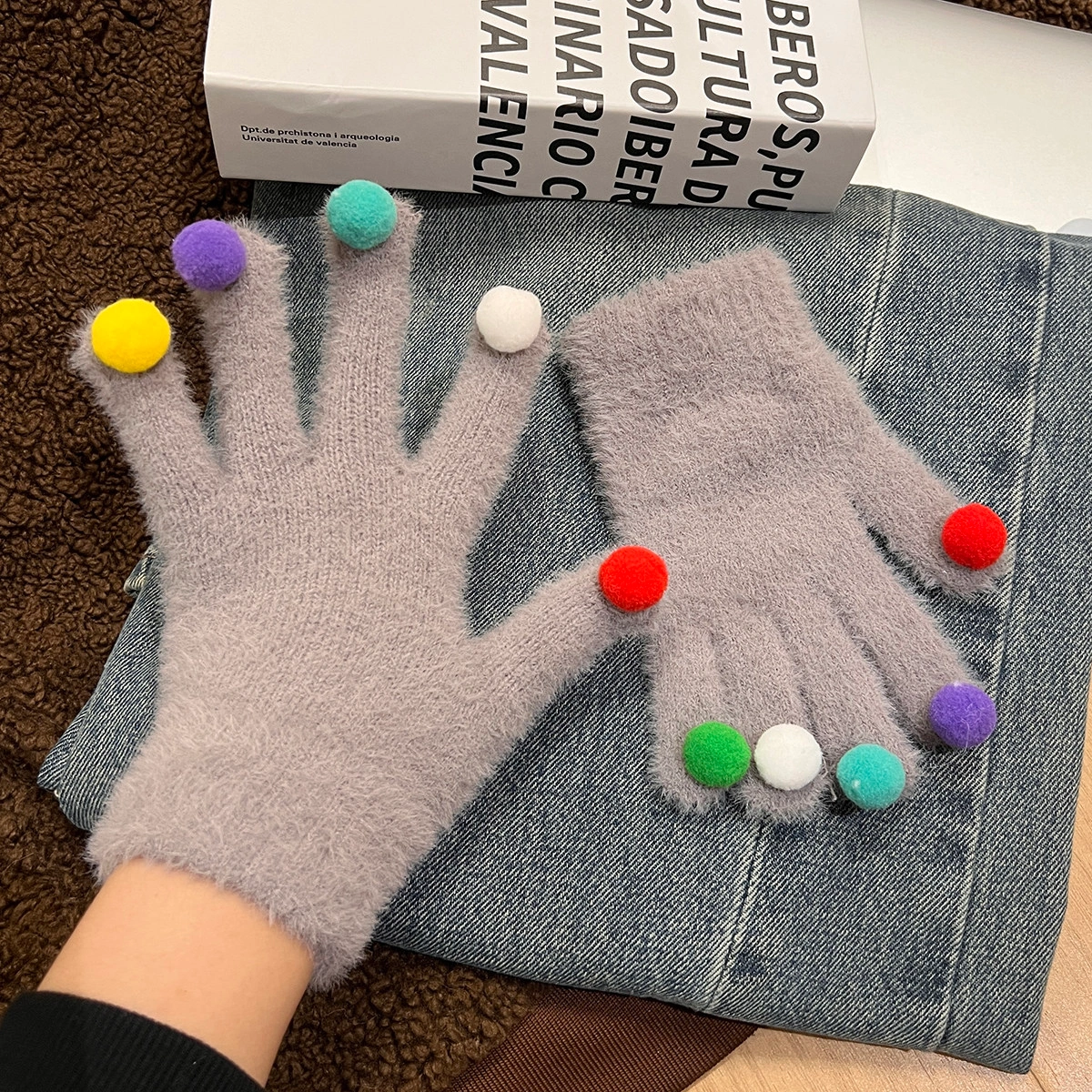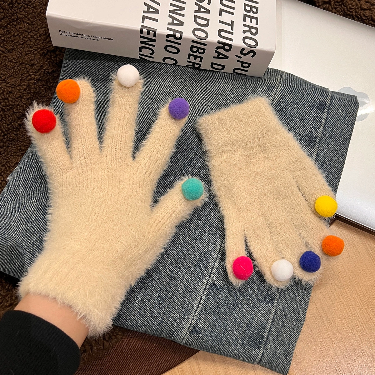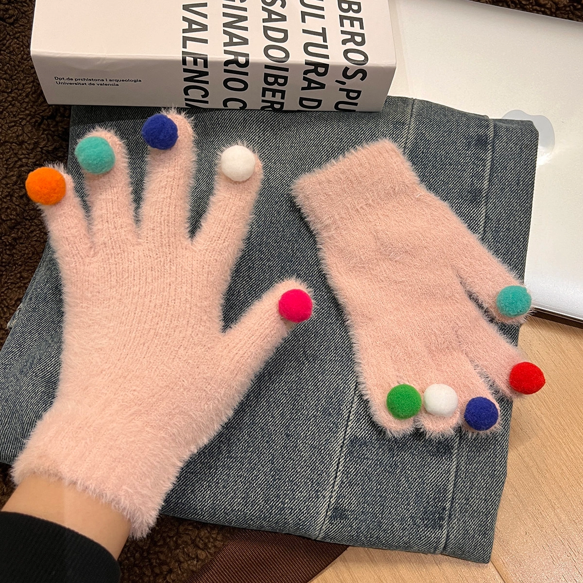 Colorful Ball Plush Gloves Winter Women's 2024 New Style Fleece-Lined Warm and Cold-Proof Student Cycling Electric Vehicle Five-Finger Gloves