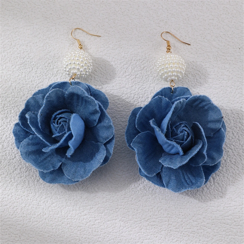 French Camellia Denim Blue Fabric Earrings for Women, Floral Earrings with a High-End, Light Luxury Design and Fashionable Feel