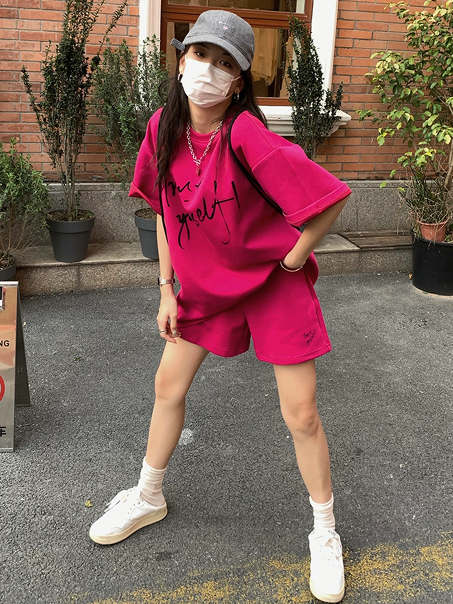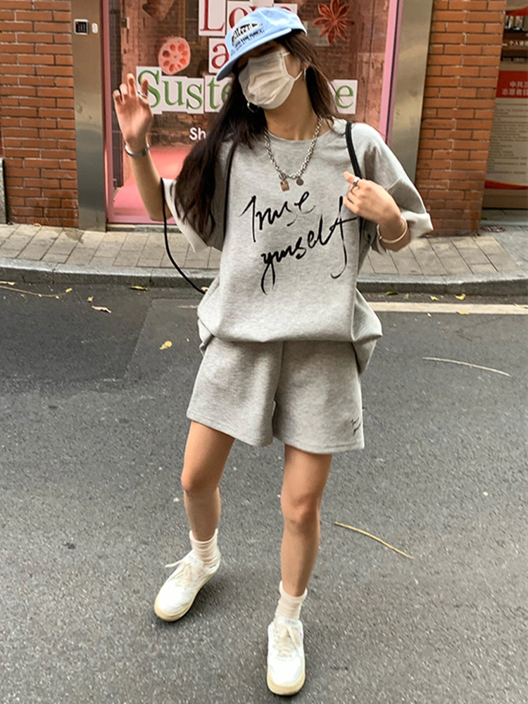 Casual Sports Suit for Women, Summer Student Korean Style, Loose, Slimming, Fashionable Short-Sleeved Shorts, Running Two-Piece Set, Pure Cotton