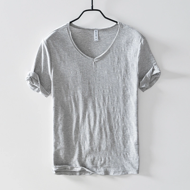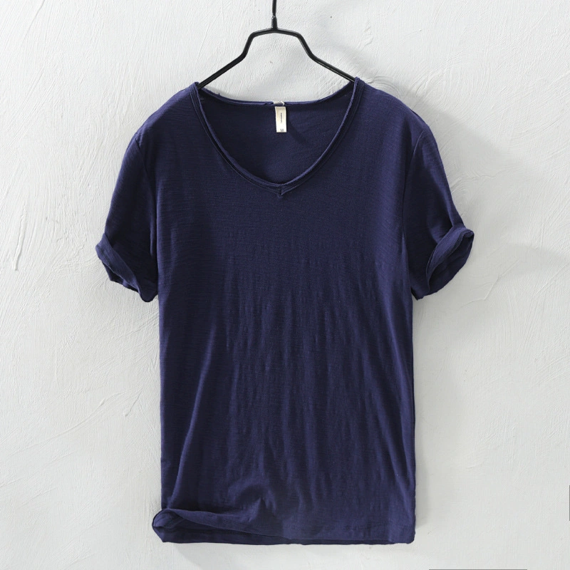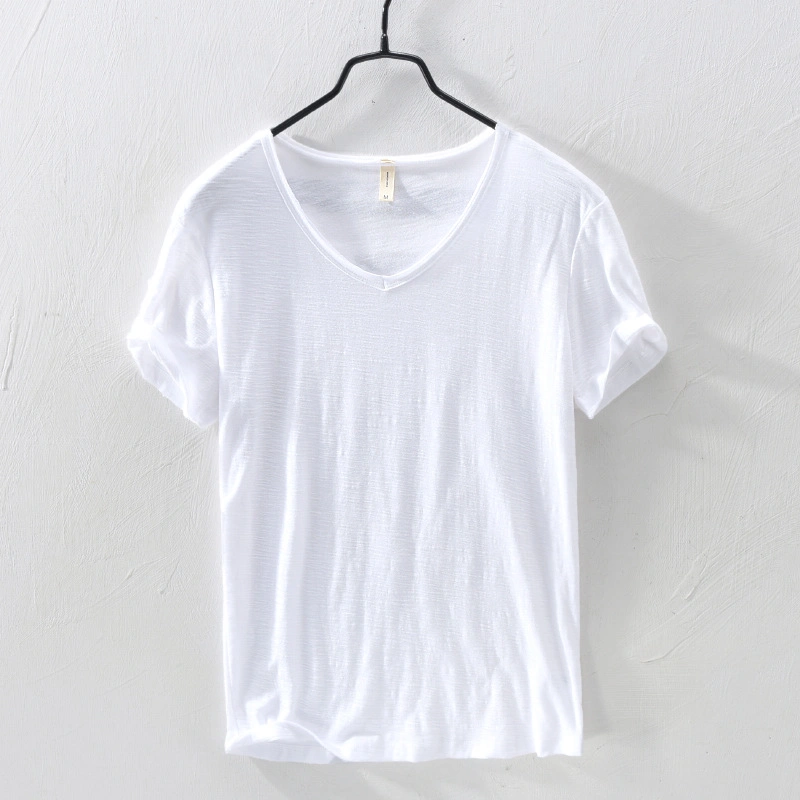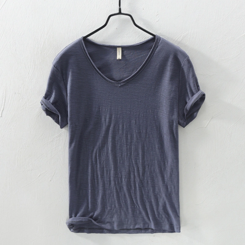 Soft Bamboo Cotton Short-Sleeved T-Shirt Men's Casual Thin Japanese Style Style Distressed Raw Edge V Neck Slim Cotton Men's T-Shirt