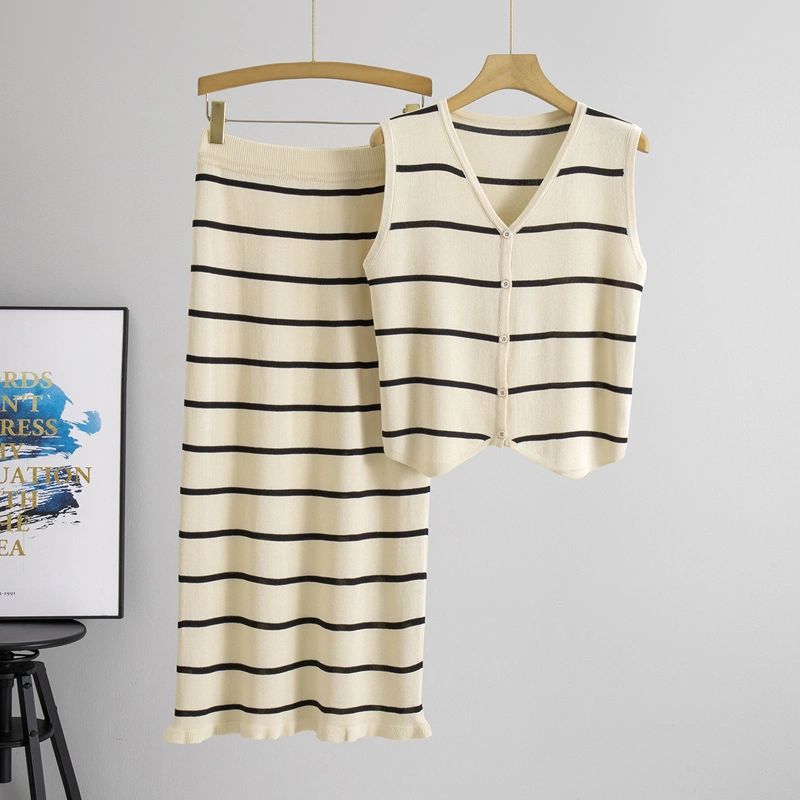 Korean Style Retro Striped Knitted Vest Cardigan Fashionable Versatile Bodycon Skirt Elegant Two-Piece Set Trendy