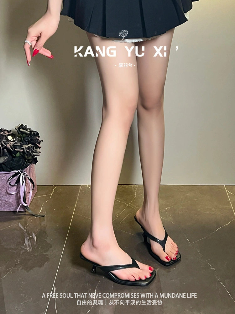 Beautiful and Elegant High-Heeled Shoes for Women, Black 2025 New Style, Slip-On Thong Sandals, Kitten Heel Flip-Flops