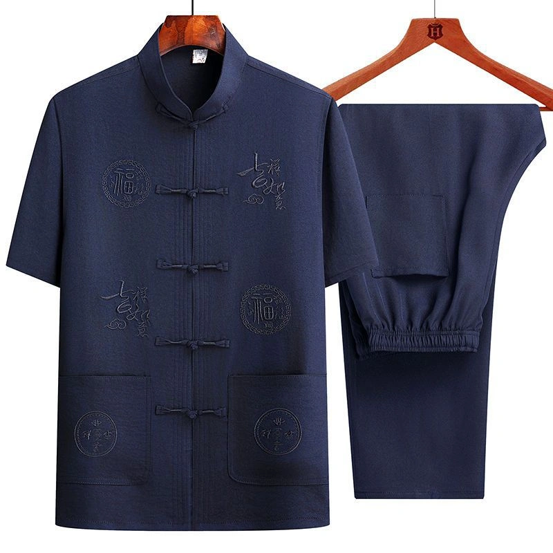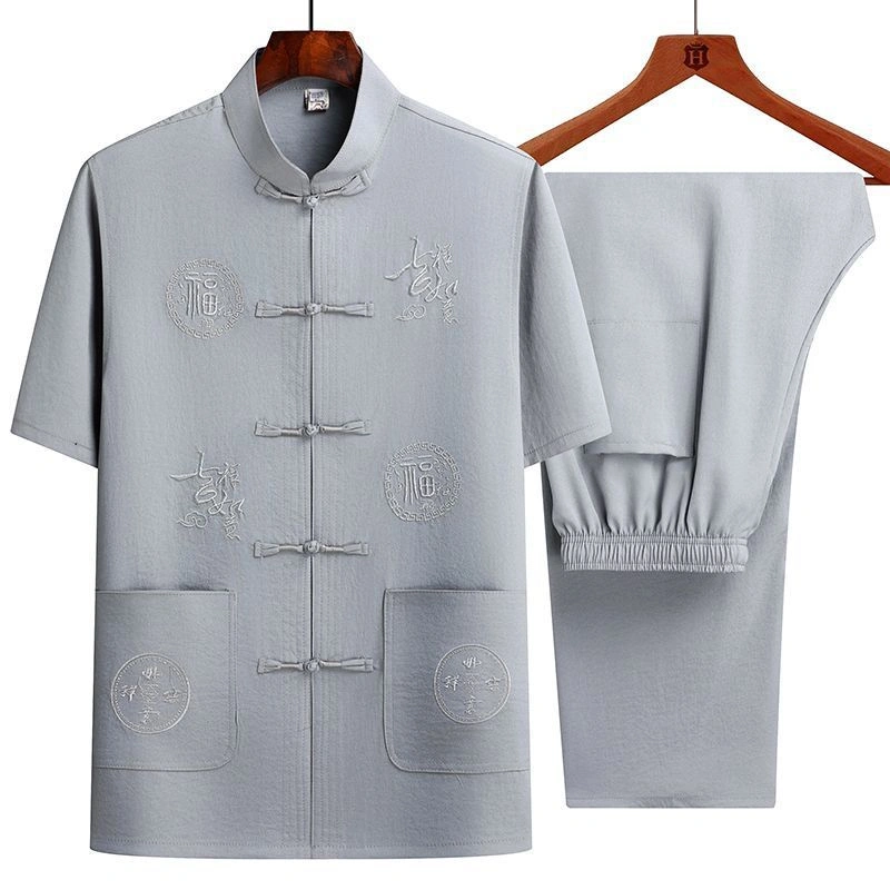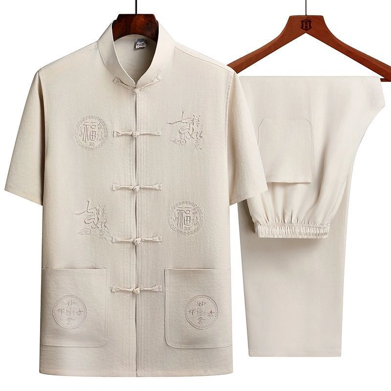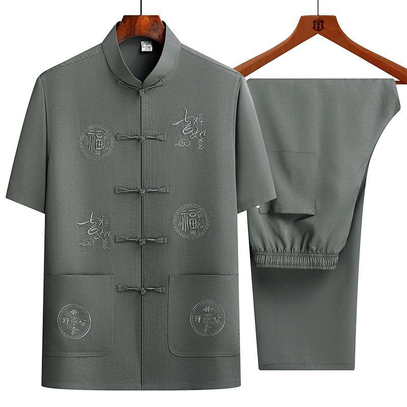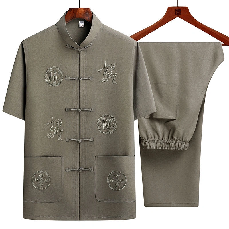 Middle-Aged and Elderly Men's Short-Sleeved Shirts, Summer New Chinese-Style Men's Clothing, Dad's Suit, Two-Piece Shirt Set, Elderly Tang Suit, Grandpa