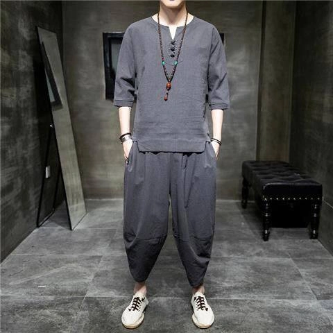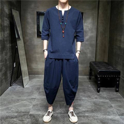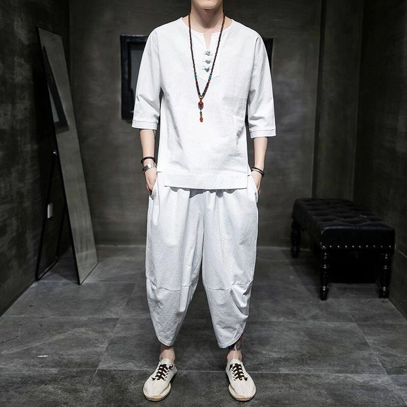 Summer Chinese Style Linen Suit Men's Short-Sleeved T-Shirt Casual Loose Ancient Style Large Size Cotton and Linen Hanfu T-Shirt