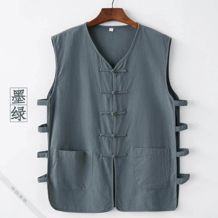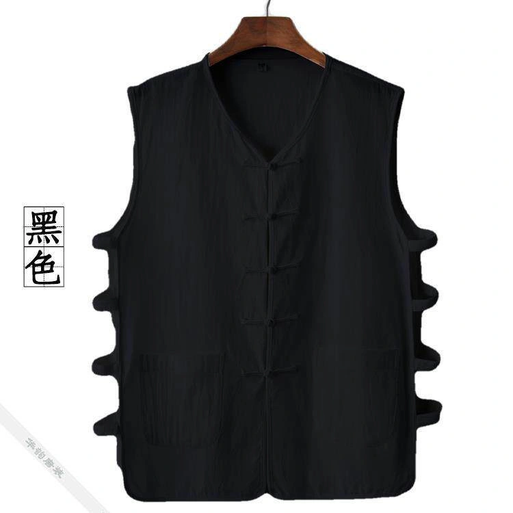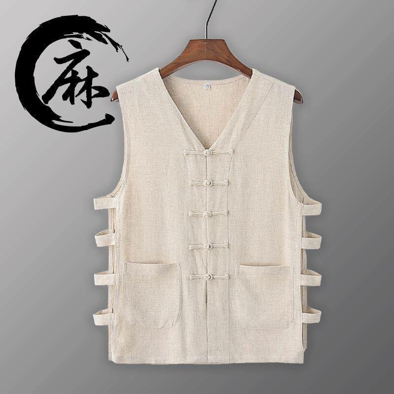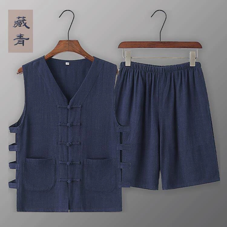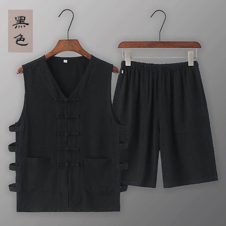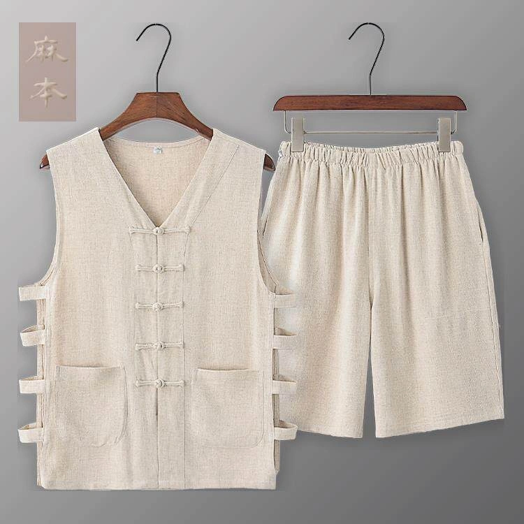 Summer Cotton and Linen Thin Tang Suit Men's Vest Sleeveless Vest Set with Button-Up Retro Undershirt Jacket Old Man's Shirt