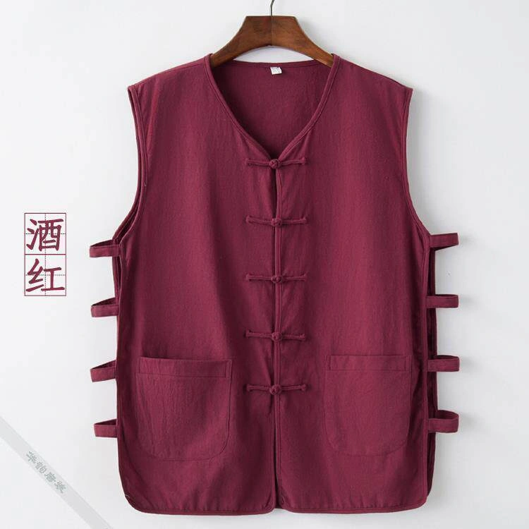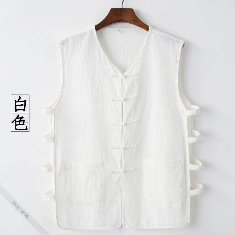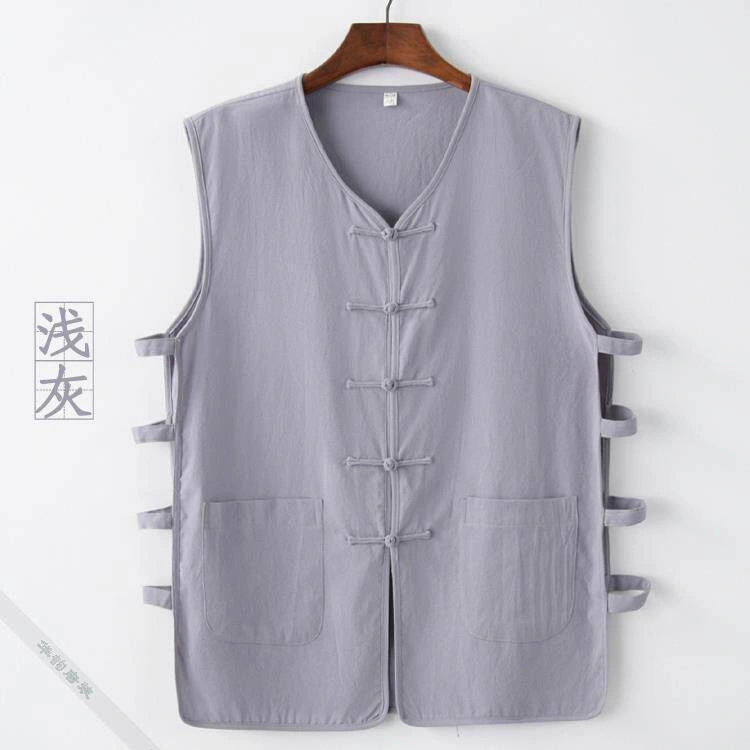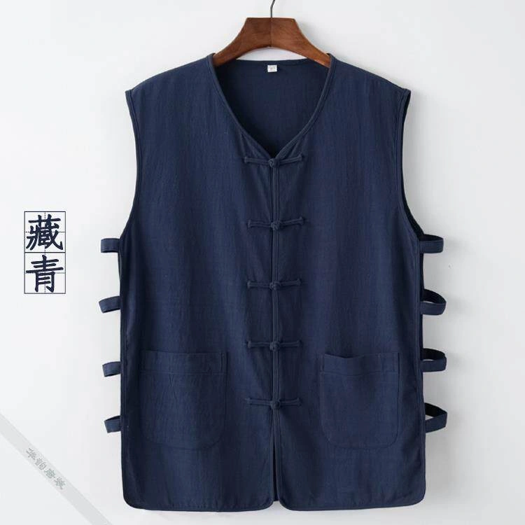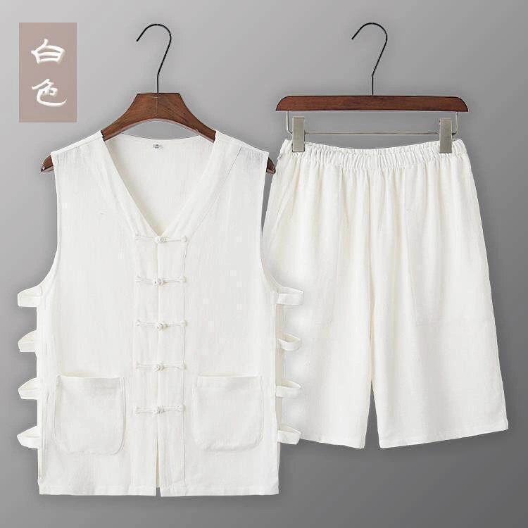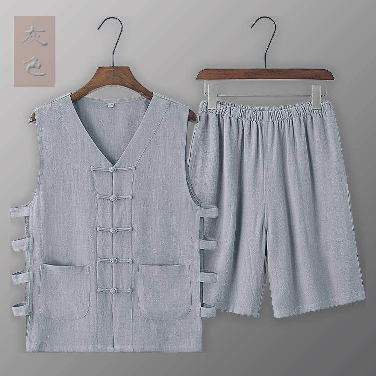 Summer Cotton and Linen Thin Tang Suit Men's Vest Sleeveless Vest Set with Button-Up Retro Undershirt Jacket Old Man's Shirt