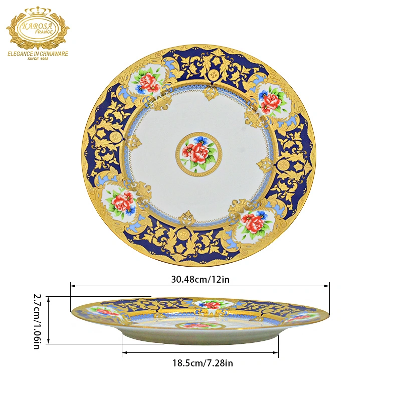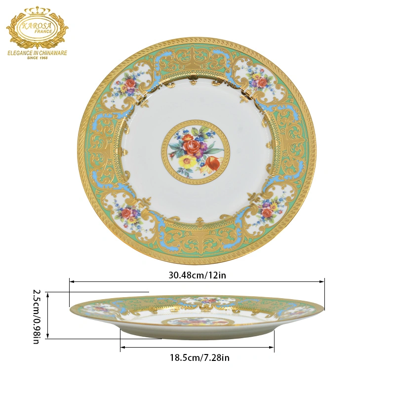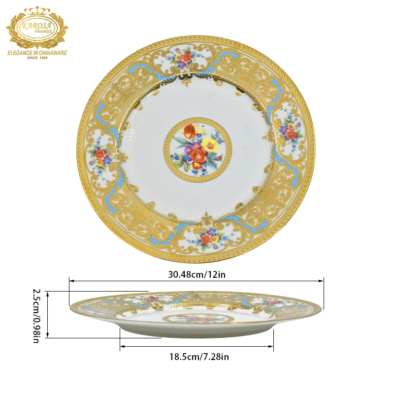 European-Style High-End Bone China Embossed Gold 12inch Flat Plate Steak Plate Salad Plate Round Plate Household Dish Plate