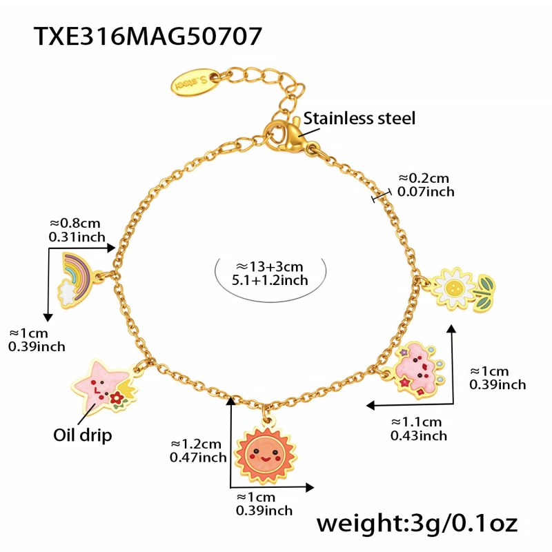 Cute and Playful Children's Jewelry Set with Oil-Drip Design Featuring Sun, Stars, and Clouds, Including Necklace, Bracelet, and Anklet, Made of Titanium Steel for Girls