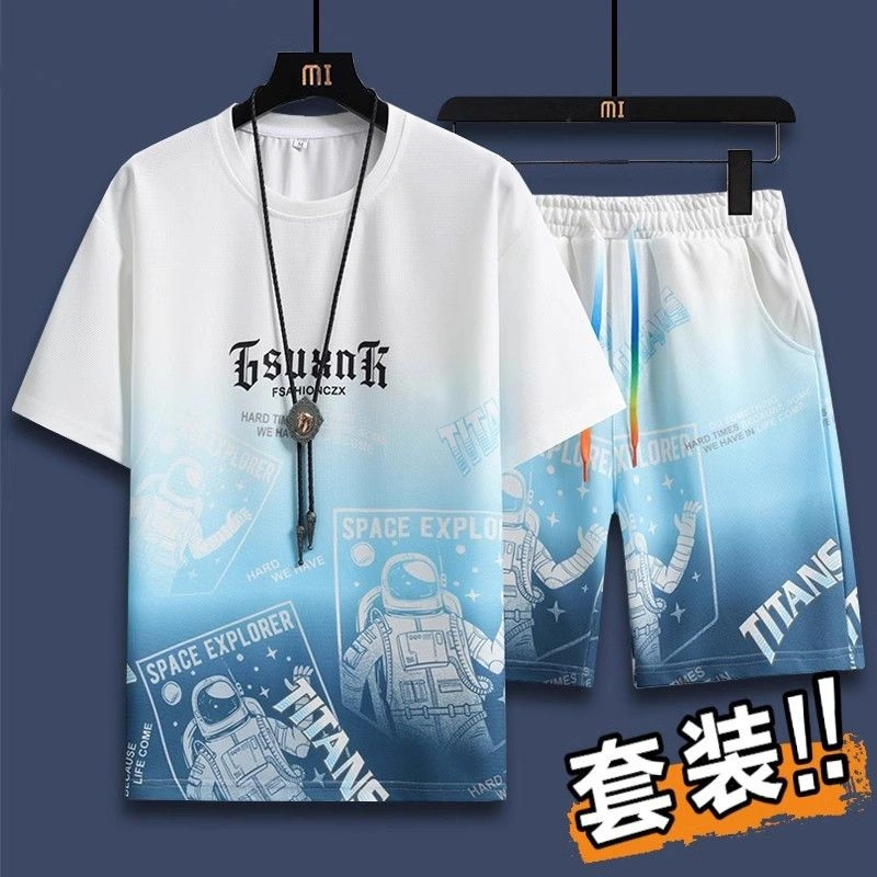 Men's Summer Ice Silk Suit Trendy Brand T-Shirt Short-Sleeved Shorts Gradient Color Casual Sports Clothes Men's Two-Piece Set