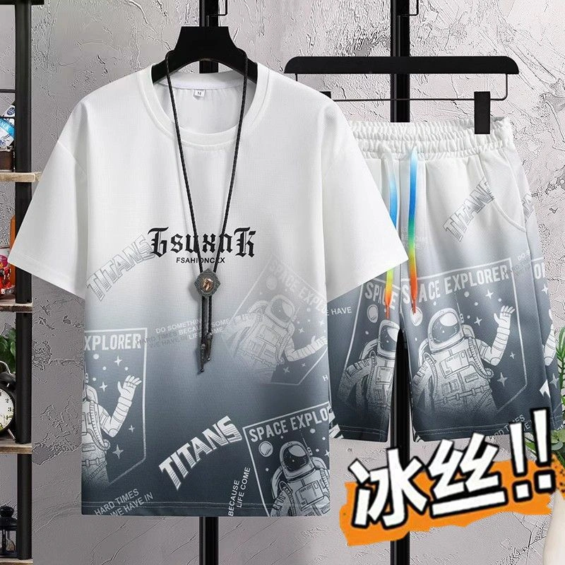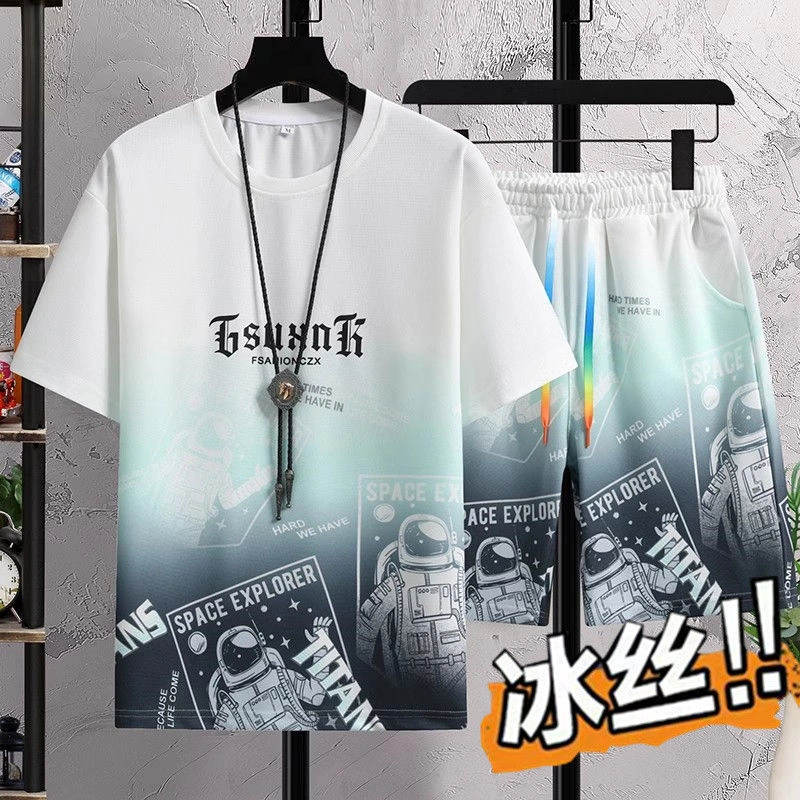 Men's Youth New Summer Ice Silk Suit Gradient Color Short-Sleeved Shorts Casual Sports Suit Sports Men's Clothing
