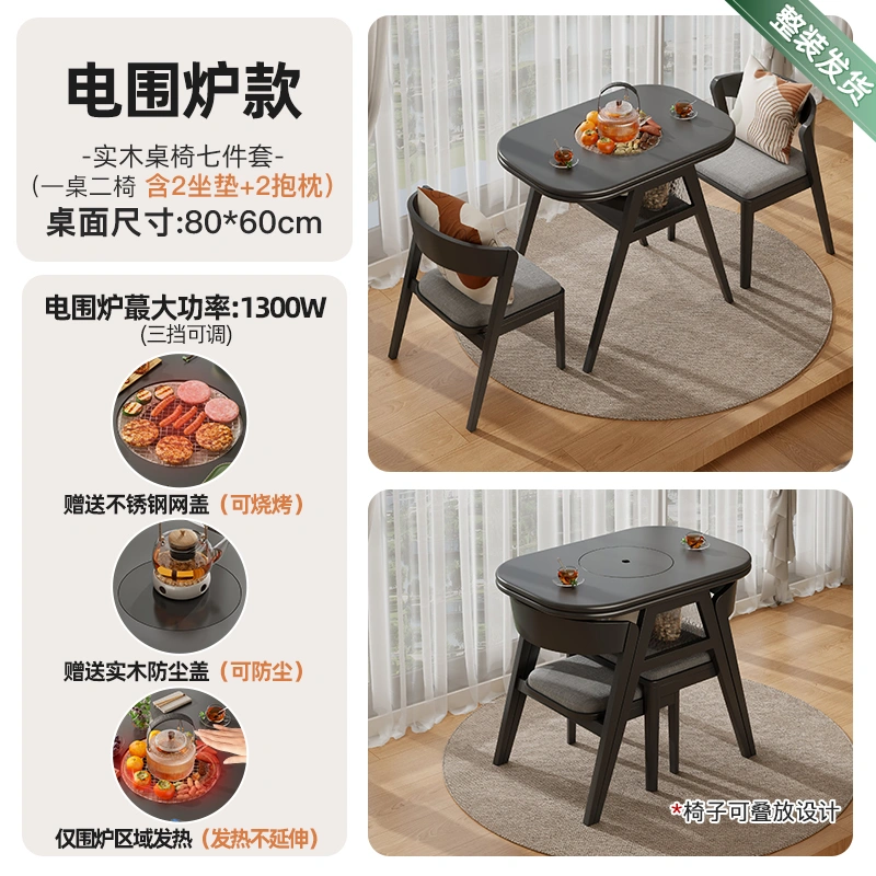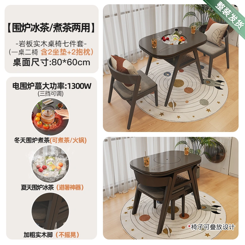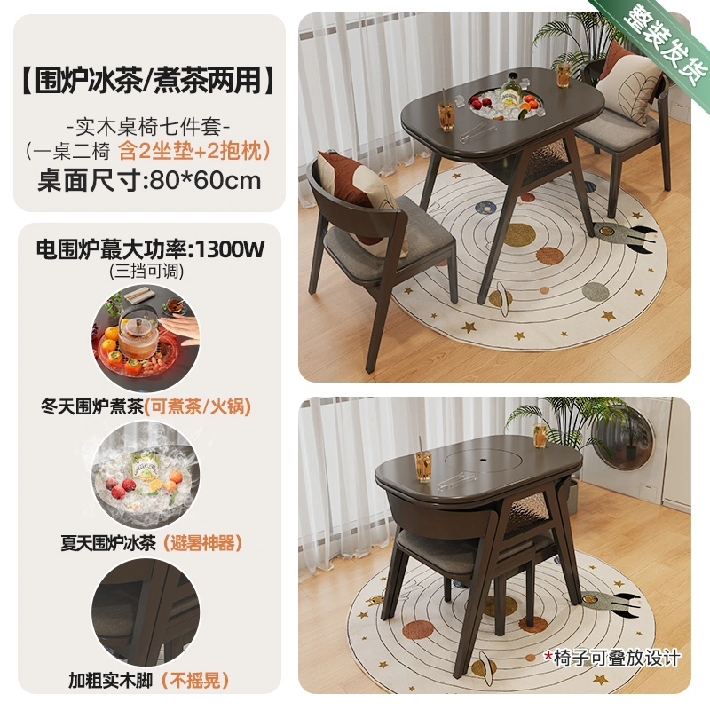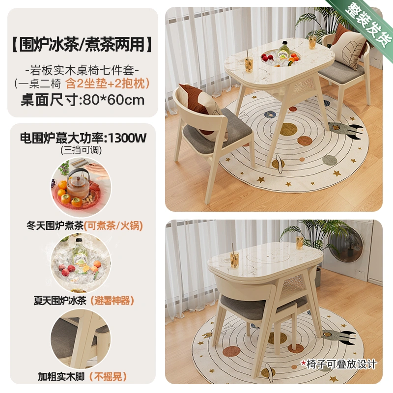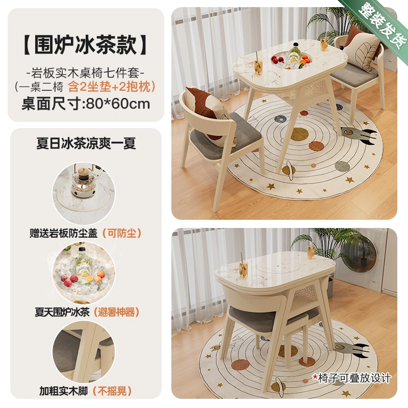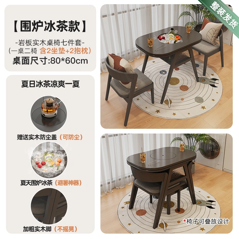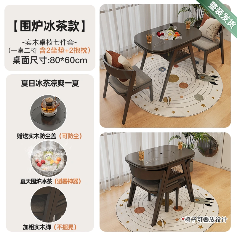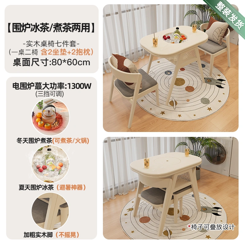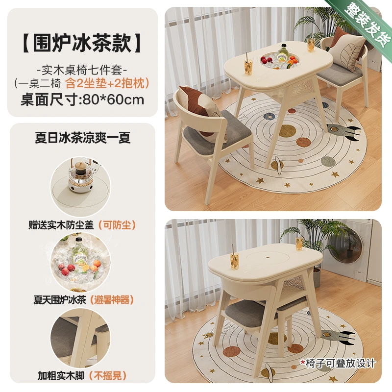 Space-Saving Dining Table with Integrated Induction Cooker, Cream-Style Rectangular Balcony Exquisite Small Table and Chairs Made of Solid Wood