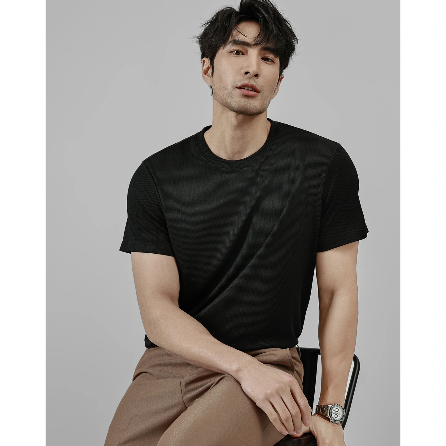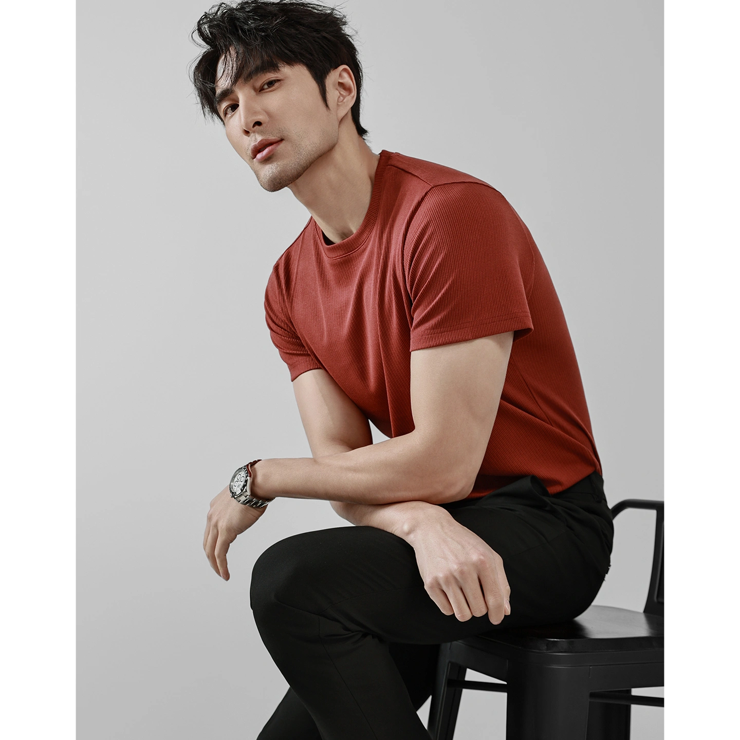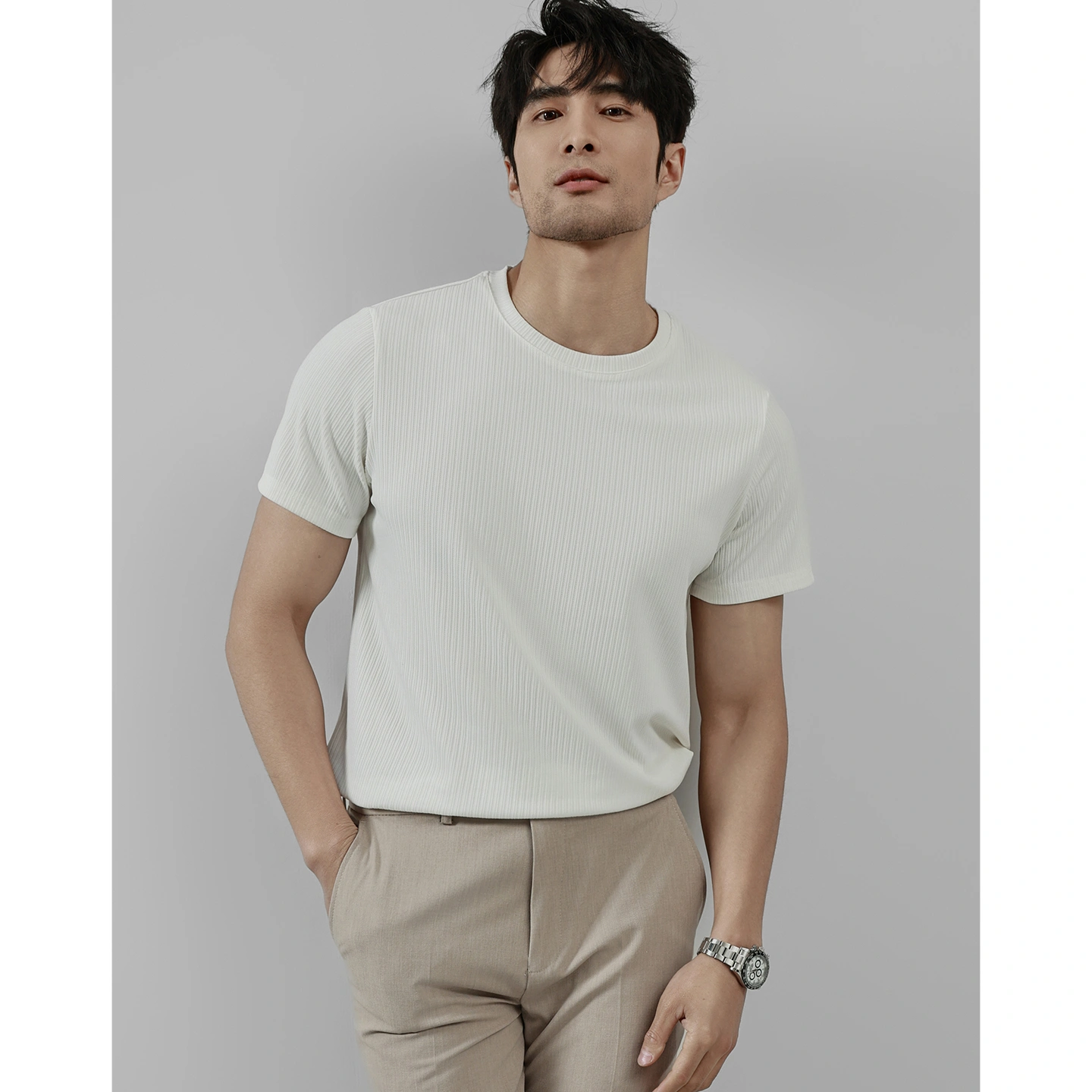 Ookaak Summer Round Neck Ice Silk Breathable Fine Striped Fitness T-Shirt Men's Basic Solid Color Elastic Quick-Drying Short-Sleeved Shirt
