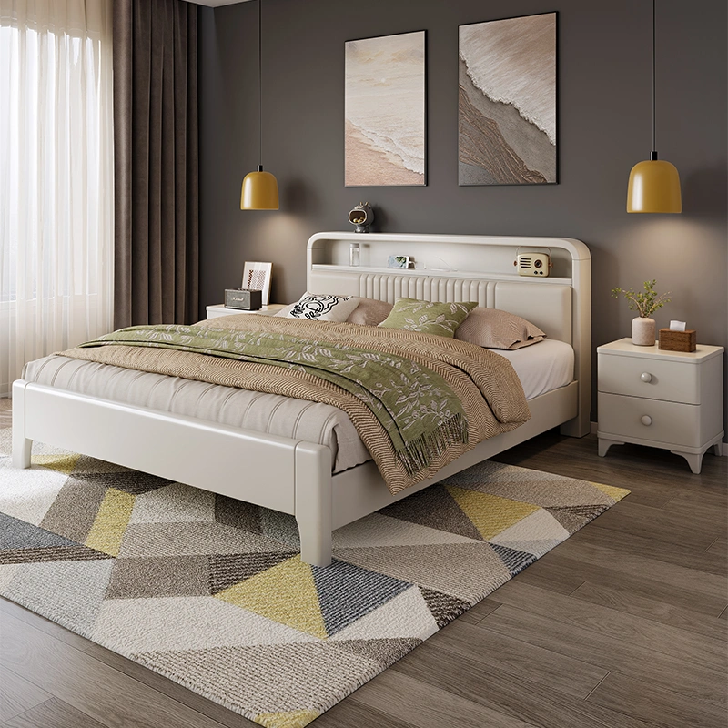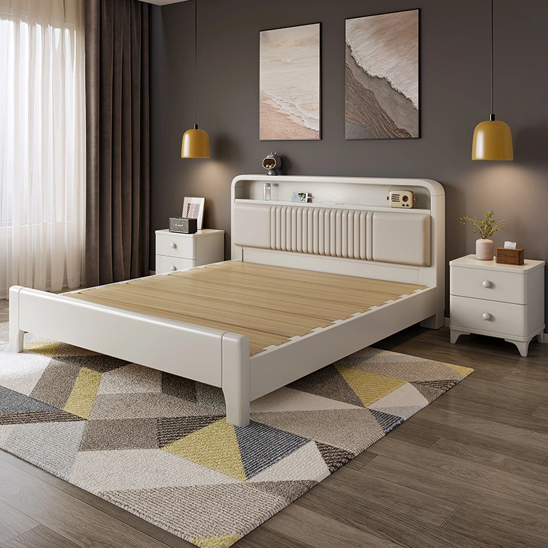 Solid Wood Bed with Soft Backrest, White 1.8m Master Bedroom Double Bed, Modern and Simple 1.5m Single Bed, Economical Storage Large Bed