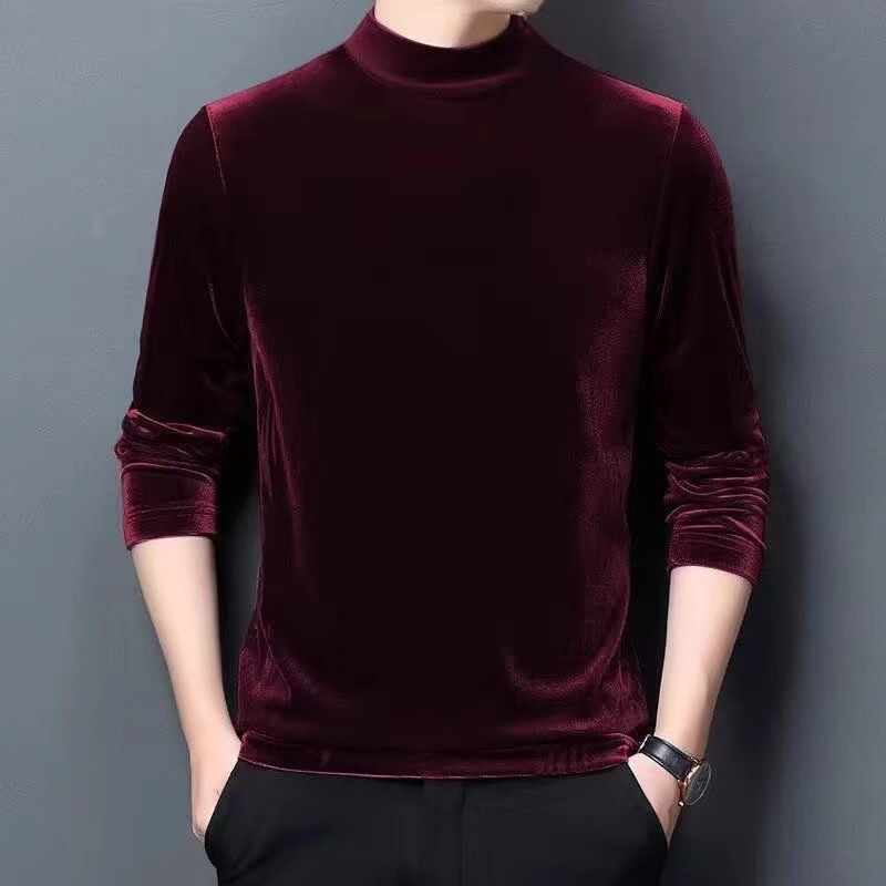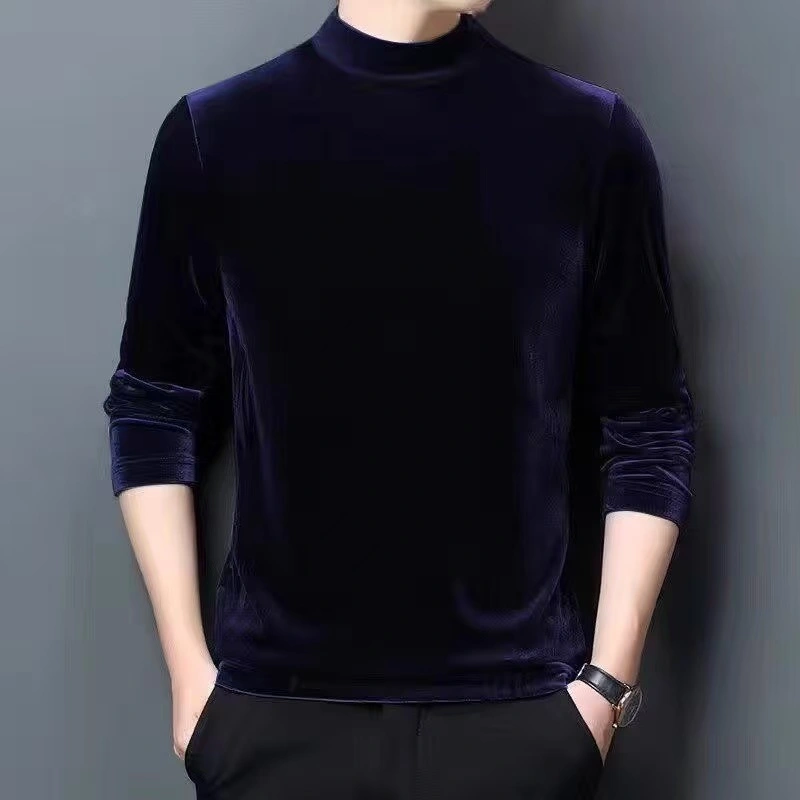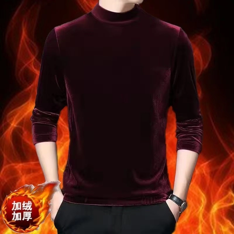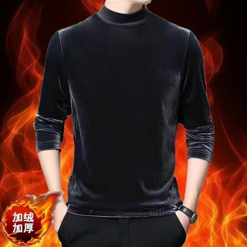 Autumn and Winter Velvet Sweatshirt for Men, Trendy Half-High Collar, Fleece-Lined, Thickened Base Layer, Thermal Underwear, Long-Sleeve T-Shirt
